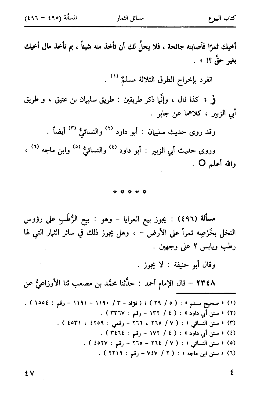 أخيك ثمرًا فأصابته جائحة، فلا يحلُّ لك أن تأخذ منه شيئًا، بم تأخذ مال أخيك بغير حقٍّ؟! ".