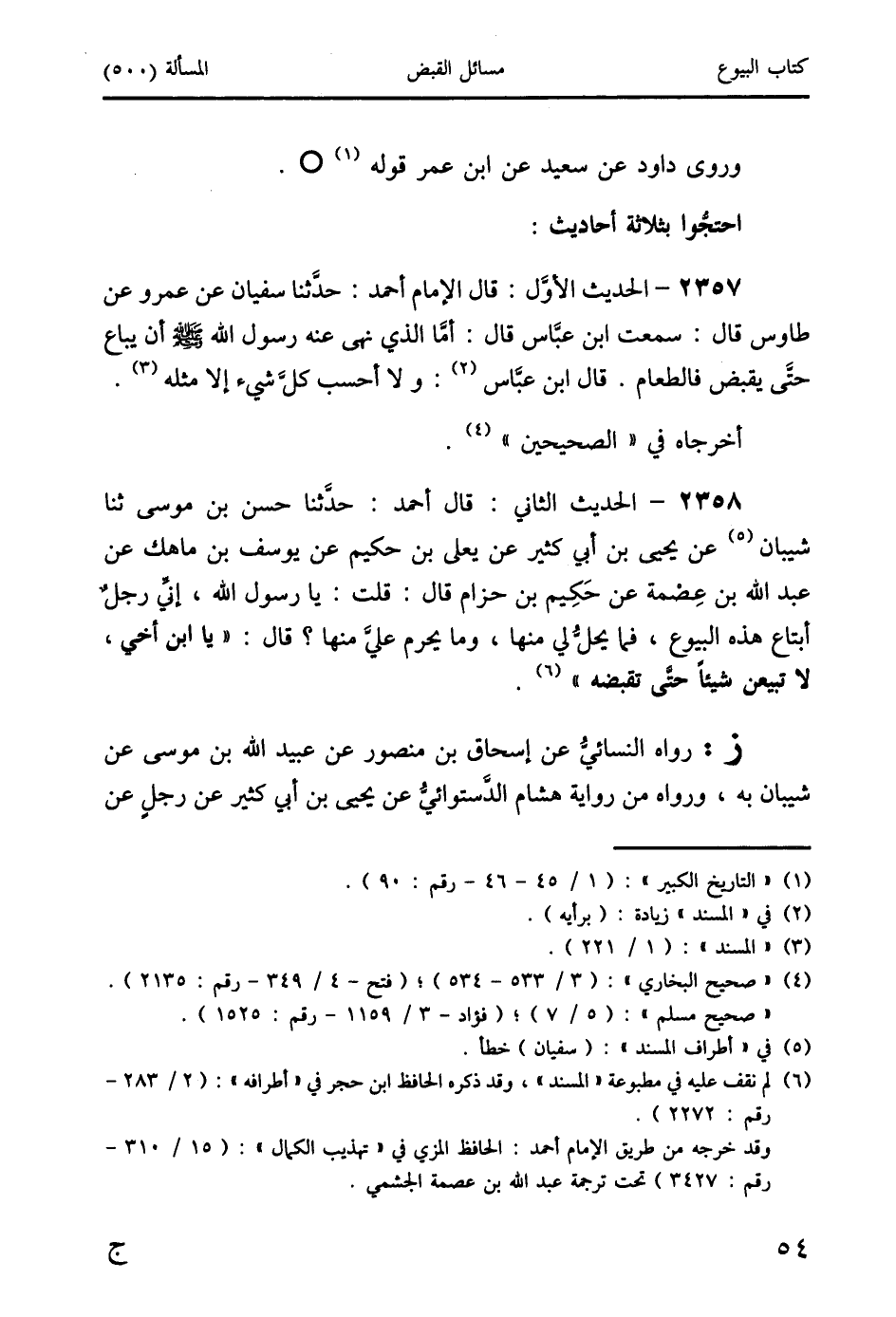 2357 - الحديث الأوَّل: قال الإمام أحمد: حدَّثنا سفيان عن عمرو عن طاوس قال: سمعت ابن عبَّاس قال: أمَّا الذي نهى عنه رسول الله صَلَّى اللَّهُ عَلَيْهِ وَسَلَّمَ أن يباع حتَّى يقبض فالطعام. قال ابن عبَّاس (2): ولا أحسب كلَّ شيء إلا مثله (3).