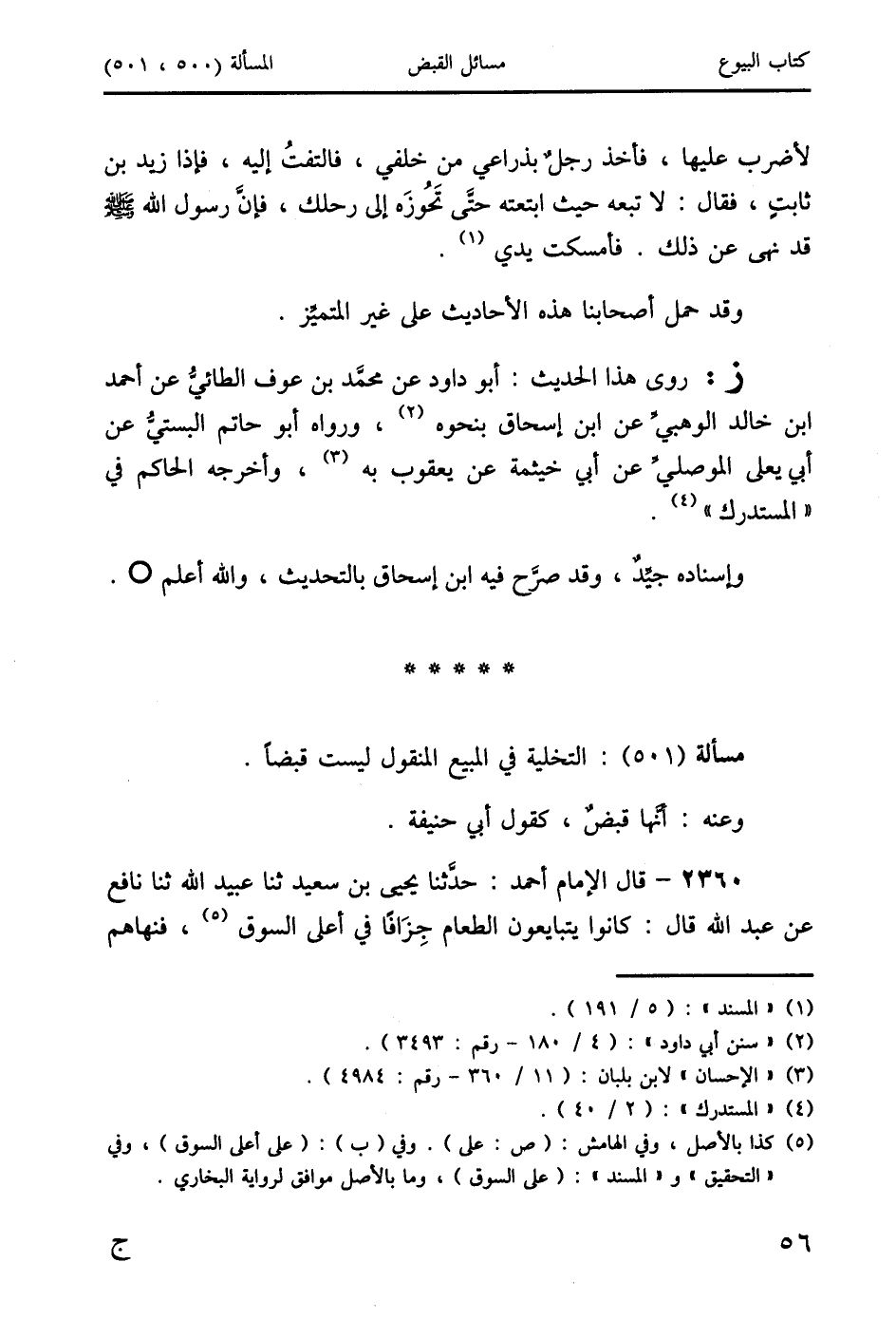 لأضرب عليها، فأخذ رجلٌ بذراعي من خلفي، فالتفتُ إليه، فإذا زيد بن ثابتٍ، فقال: لا تبعه حيث ابتعته حتَّى تَحُوزَه إلى رحلك، فإنَّ رسول الله صَلَّى اللَّهُ عَلَيْهِ وَسَلَّمَ قد نهى عن ذلك. فأمسكت يدي (1).