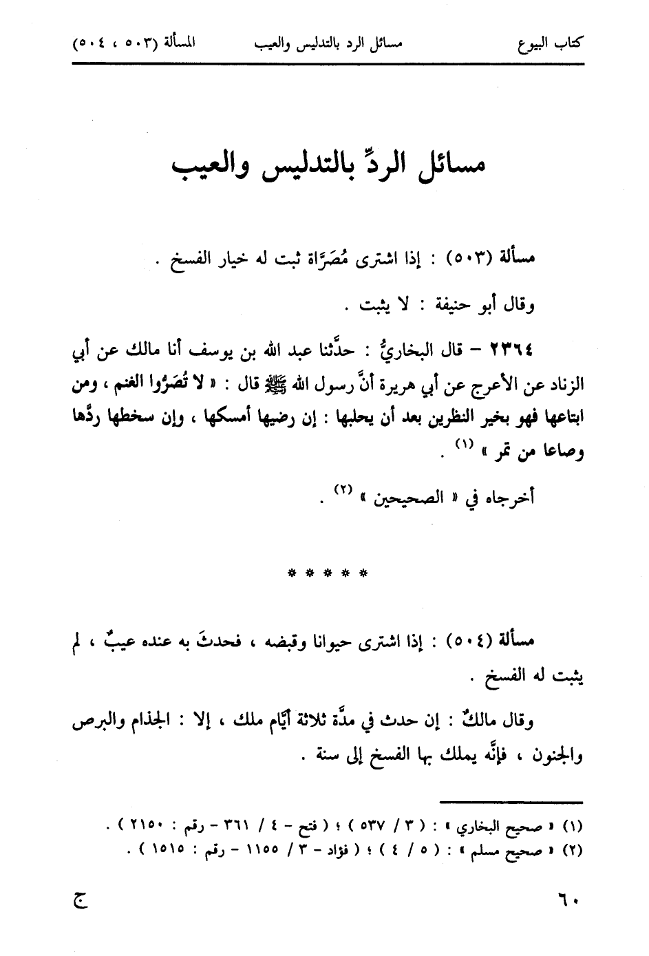 2364 - قال البخاريُّ: حدَّثنا عبد الله بن يوسف أنا مالك عن أبي الزناد عن الأعرج عن أبي هريرة أنَّ رسول الله-جمع قال: " لا تُصَرُّوا الغنم، ومن ابتاعها فهو بخير النظرين بعد أن يحلبها: إن رضيها أمسكها، وإن سخطها ردَّها