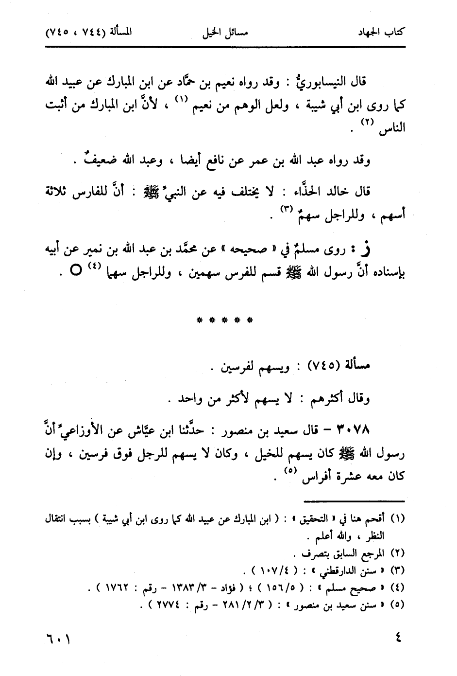 ز: روى مسلمٌ في "صحيحه" عن محمَّد بن عبد الله بن نمير عن أبيه بإسناده أنَّ رسول الله صَلَّى اللَّهُ عَلَيْهِ وَسَلَّمَ قسم للفرس سهمين، وللراجل سهمًا (4) O.