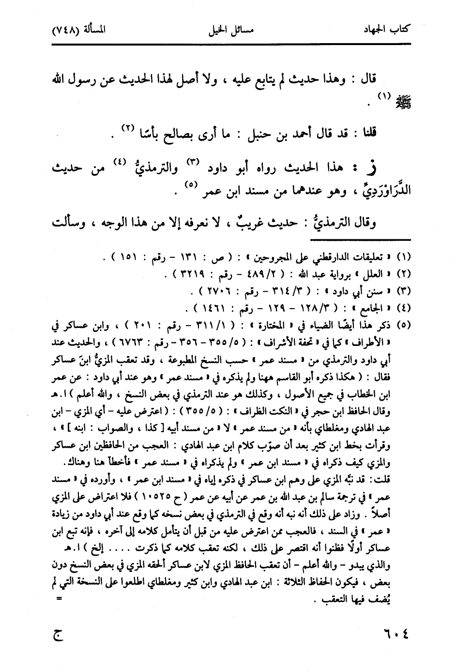 قلت: قد نبَّه المزي على وهم ابن عساكر في ذكره إياه في " مسند ابن عمر "، وأورده في " مسند عمر " في ترجمة سالم بن عبد الله بن عمر عن أبيه عن عمر (ح 10525) فلا اعتراض على المزي أصلاً. وزاد على ذلك أنه نبه أنه وقع في الترمذي في بعض نسخه كلما وقع عند أبي داود من زيادة " عمر " في السند، فالعجب ممن اعترض عليه من قبل أن يتأمل كلامه إلى آخره، فإنه تبع ابن عساكر أولاً فظنوا أنه اقتصر على ذلك، لكنه تعقب كلامه كما ذكرت .... إلخ) ا. هـ