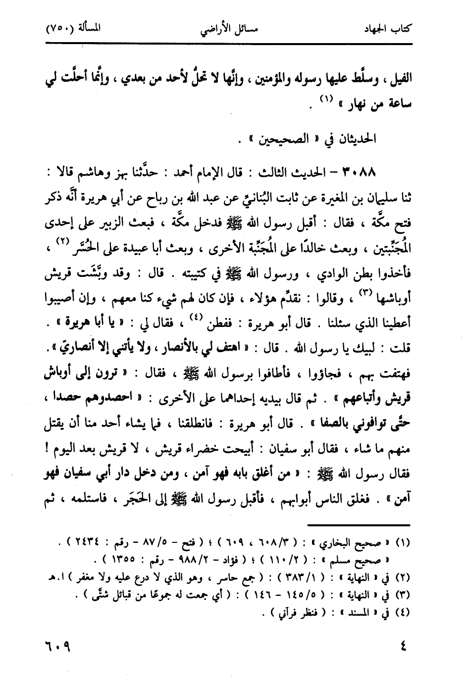3088 - الحديث الثالث: قال الإمام أحمد: حدَّثنا بهز وهاشم قالا: ثنا سليمان بن المغيرة عن ثابت البُنانيِّ عن عبد الله بن رباح عن أبي هريرة أنَّه ذكر فتح مكَّة، فقال: أقبل رسول الله صَلَّى اللَّهُ عَلَيْهِ وَسَلَّمَ فدخل مكَّة، فبعث الزبير على إحدى المُجَنِّبتين، وبعث خالدًا على المُجَنِّبة الأخرى، وبعث أبا عبيدة على الحُسَّر (2)، فأخذوا بطن الوادي، ورسول الله صَلَّى اللَّهُ عَلَيْهِ وَسَلَّمَ في كتيبته. قال: وقد وبَّشَت قريش أوباشها (3)، وقالوا: نقدِّم هؤلاء، فإن كان لهم شيء كنا معهم، وإن أصيبوا أعطينا الذي سئلنا. قال أبو هريرة: ففطن (4)، فقال لي: " يا أبا هريرة ".