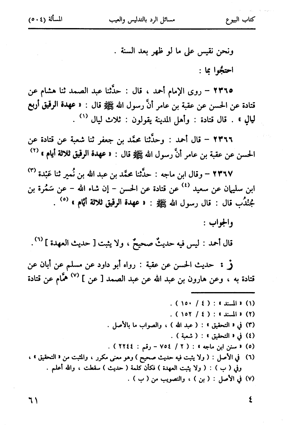 2365 - روى الإمام أحمد، قال: حدَّثنا عبد الصمد ثنا هشام عن قتادة عن الحسن عن عقبة بن عامر أنَّ رسول الله-صَلَّى اللَّهُ عَلَيْهِ وَسَلَّمَ قال: " عهدة الرقيق أربع ليالٍ ". قال قتادة: وأهل المدينة يقولون: ثلاث ليال (1).