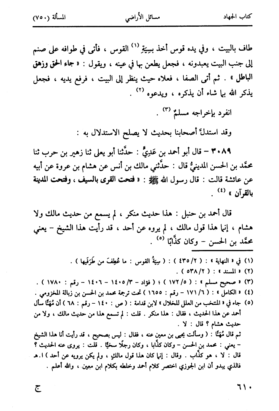 3089 - قال أبو أحمد بن عَدِيٍّ: حدَّثنا أبو يعلى ثنا زهير بن حرب ثنا محمَّد بن الحسن المدينيُّ قال: حدَّثني مالك بن أنس عن هشام بن عروة عن أبيه عن عائشة قالت: قال رسول الله صَلَّى اللَّهُ عَلَيْهِ وَسَلَّمَ: " فتحت القرى بالسيف، وفتحت المدينة بالقرآن " (4).