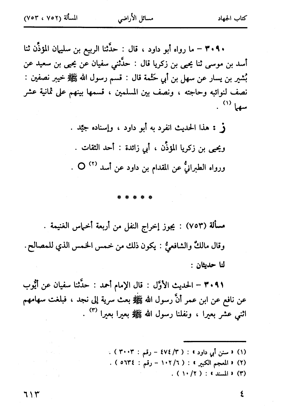 3091 - الحديث الأوَّل: قال الإمام أحمد: حدَّثنا سفيان عن أيُّوب عن نافع عن ابن عمر أنَّ رسول الله صَلَّى اللَّهُ عَلَيْهِ وَسَلَّمَ بعث سرية إلى نجد، فبلغت سهامهم اثني عشر بعيرًا، ونفلنا رسول الله صَلَّى اللَّهُ عَلَيْهِ وَسَلَّمَ بعيرًا بعيرًا (3).