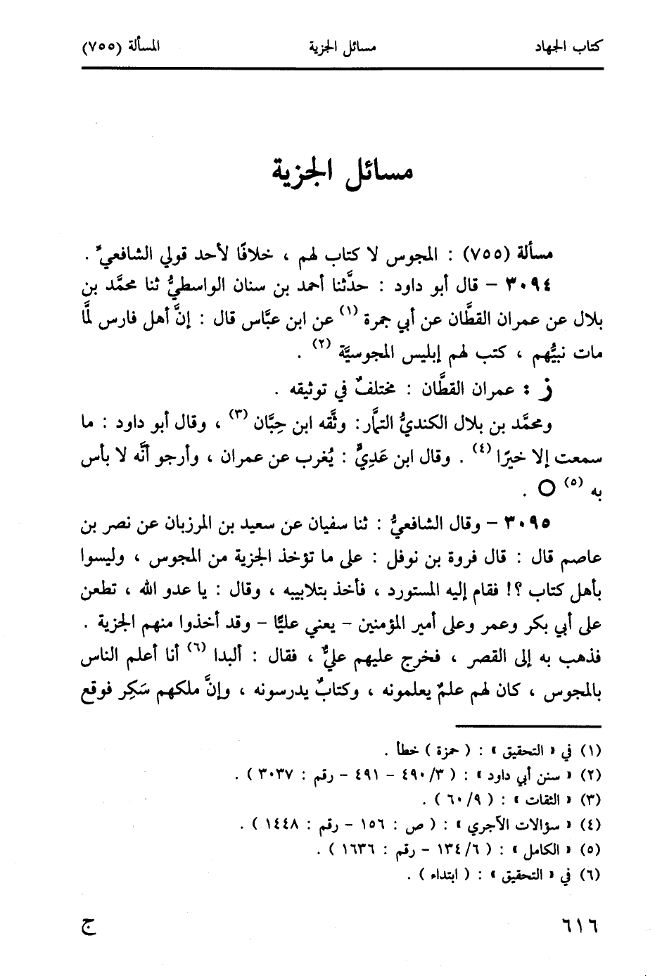 3095 - وقال الشافعيُّ: ثنا سفيان عن سعيد بن المرزبان عن نصر بن عاصم قال: قال فروة بن نوفل: على ما تؤخذ الجزية من المجوس، وليسوا بأهل كتاب؟! فقام إليه المستورد، فأخذ بتلابيبه، وقال: يا عدو الله، تطعن