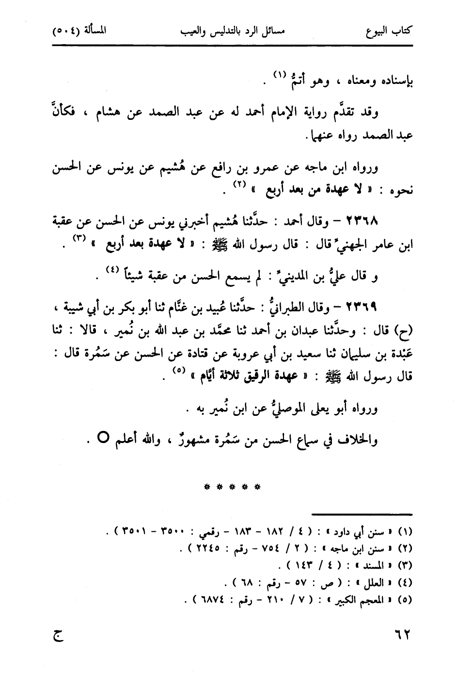 ورواه ابن ماجة عن عمرو بن رافع عن هُشيم عن يونس عن الحسن نحوه: " لا عهد" من بعد أربع " (2).