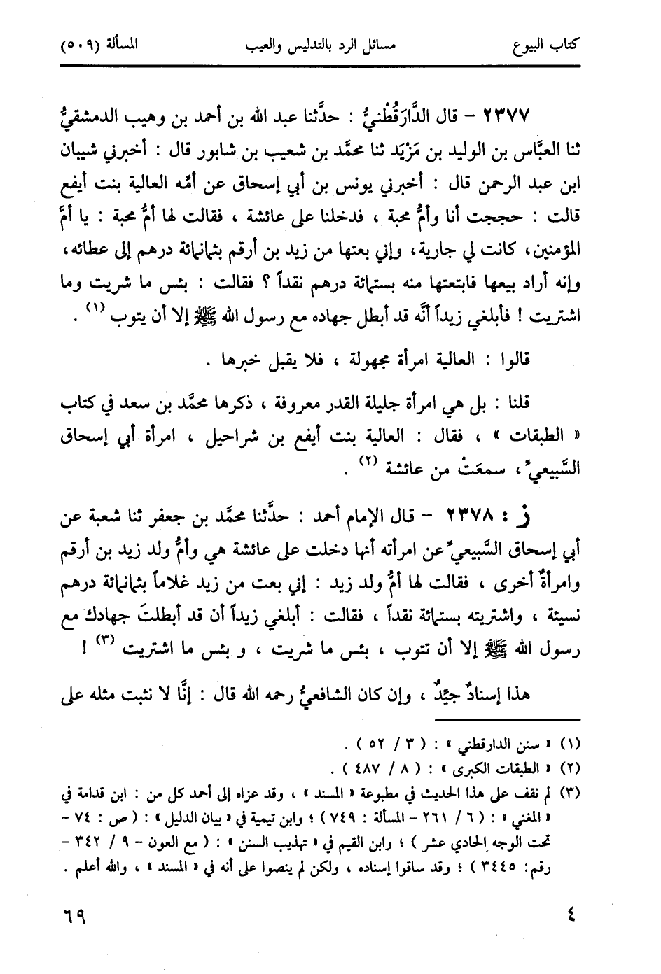نسيئة، واشتريته بستمائة نقدًا، فقالت: أبلغي زيدًا أن قد أبطلتَ جهادك مع رسول الله صَلَّى اللَّهُ عَلَيْهِ وَسَلَّمَ إلا أن تتوب، بئس ما شريت، وبئس ما اشتريت (3)! هذا إسنادٌ جيدٌ، وإن كان الشافعيُّ رحمه الله قال: إنَّا لا نثبت مثله على