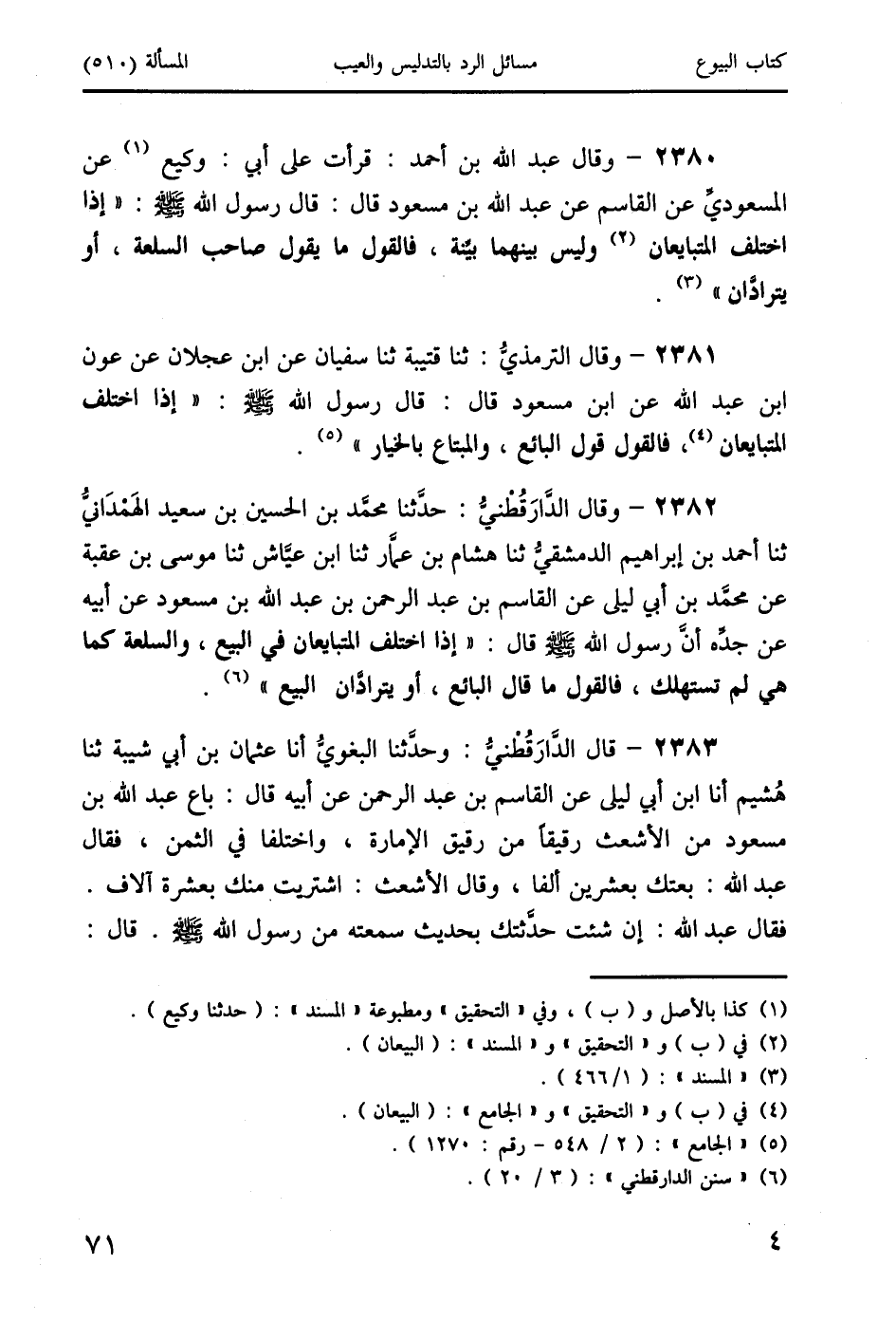 2383 - قال الدَّارَقُطْنِيُّ: وحدَّثنا البغويُّ أنا عثمان بن أبي شيبة ثنا هُشيم أنا ابن أبي ليلى عن القاسم بن عبد الرحمن عن أبيه قال: باع عبد الله بن مسعود من الأشعث رقيقًا من رقيق الإمارة، واختلفا في الثمن، فقال عبد الله: بعتك بعشرين ألفا، وقال الأشعث: اشتريت منك بعشرة آلاف. فقال عبد الله: إن شئت حدَّثتك بحديث سمعته من رسول الله صَلَّى اللَّهُ عَلَيْهِ وَسَلَّمَ. قال: