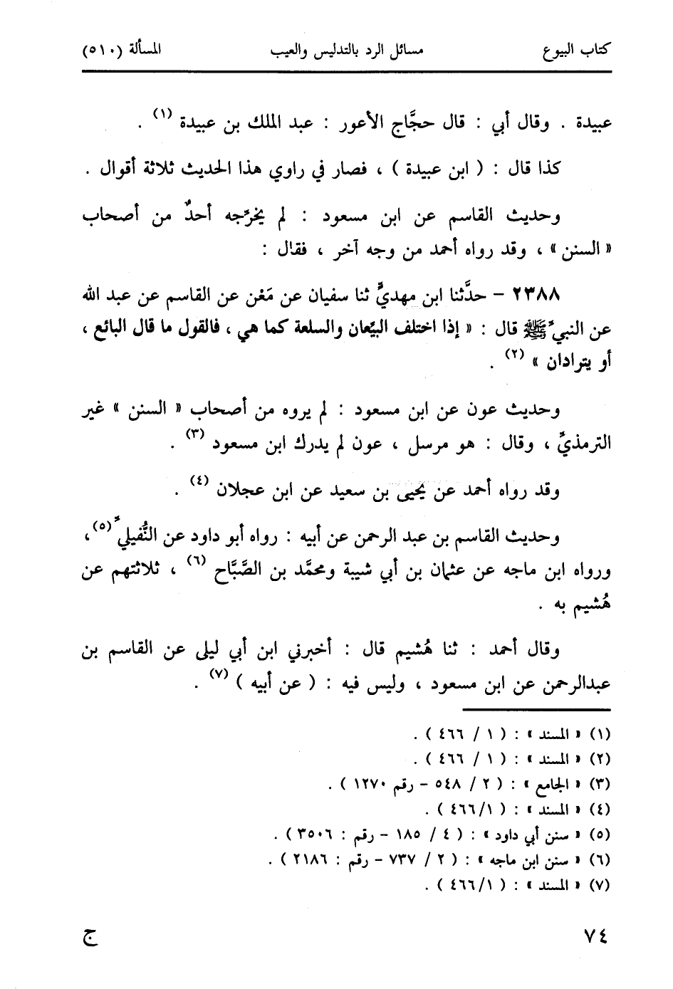 2388 - حدَّثنا ابن مهديٍّ ثنا سفيان عن مَعْن عن القاسم عن عبد الله عن النبيِّ صَلَّى اللَّهُ عَلَيْهِ وَسَلَّمَ قال: " إذا اختلف البيِّعان والسلعة كما هي، فالقول ما قال البائع، أو يترادان " (2).