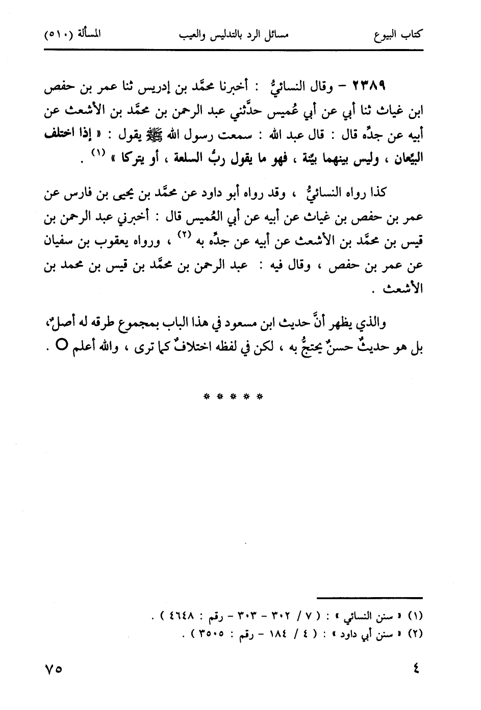 2389 - وقال النسائيُّ: أخيرنا محمَّد بن إدريس ثنا عمر بن حفص ابن غياث ثنا أبي عن أبي عُميس حدَّثني عبد الرحمن بن محمَّد بن الأشعث عن أبيه عن جدِّه قال: قال عبد الله: سمعت رسول الله صَلَّى اللَّهُ عَلَيْهِ وَسَلَّمَ يقول: " إذا اختلف البيِّعان، ويس بينهما بيِّنه، فهو ما يقول ربُّ السلعة، أو يتركا " (1).