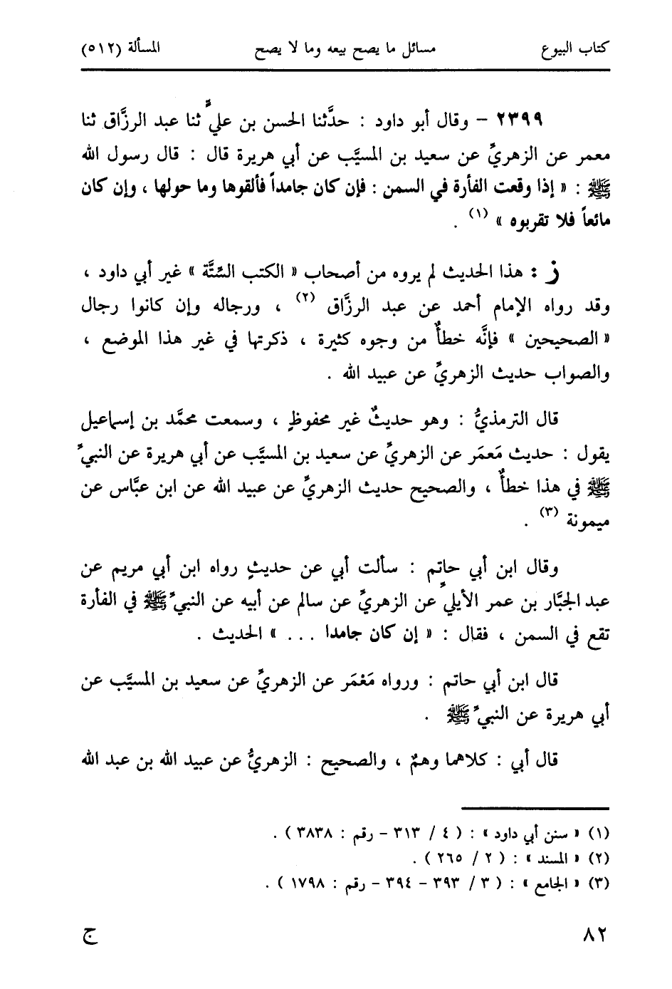 2399 - وقال أبو داود: حدَّثنا الحسن بن عليٍّ ثنا عبد الرزَّاق ثنا معمر عق الزهريِّ عن سعيد بن المسيَّب عن أبي هريرة قال: قال رسول الله صَلَّى اللَّهُ عَلَيْهِ وَسَلَّمَ: " إذا وقعت الفأرة في السمن: فإن كان جامدًا فألقوها وما حولها، وان كان مائعًا فلا تقربوه " (1).