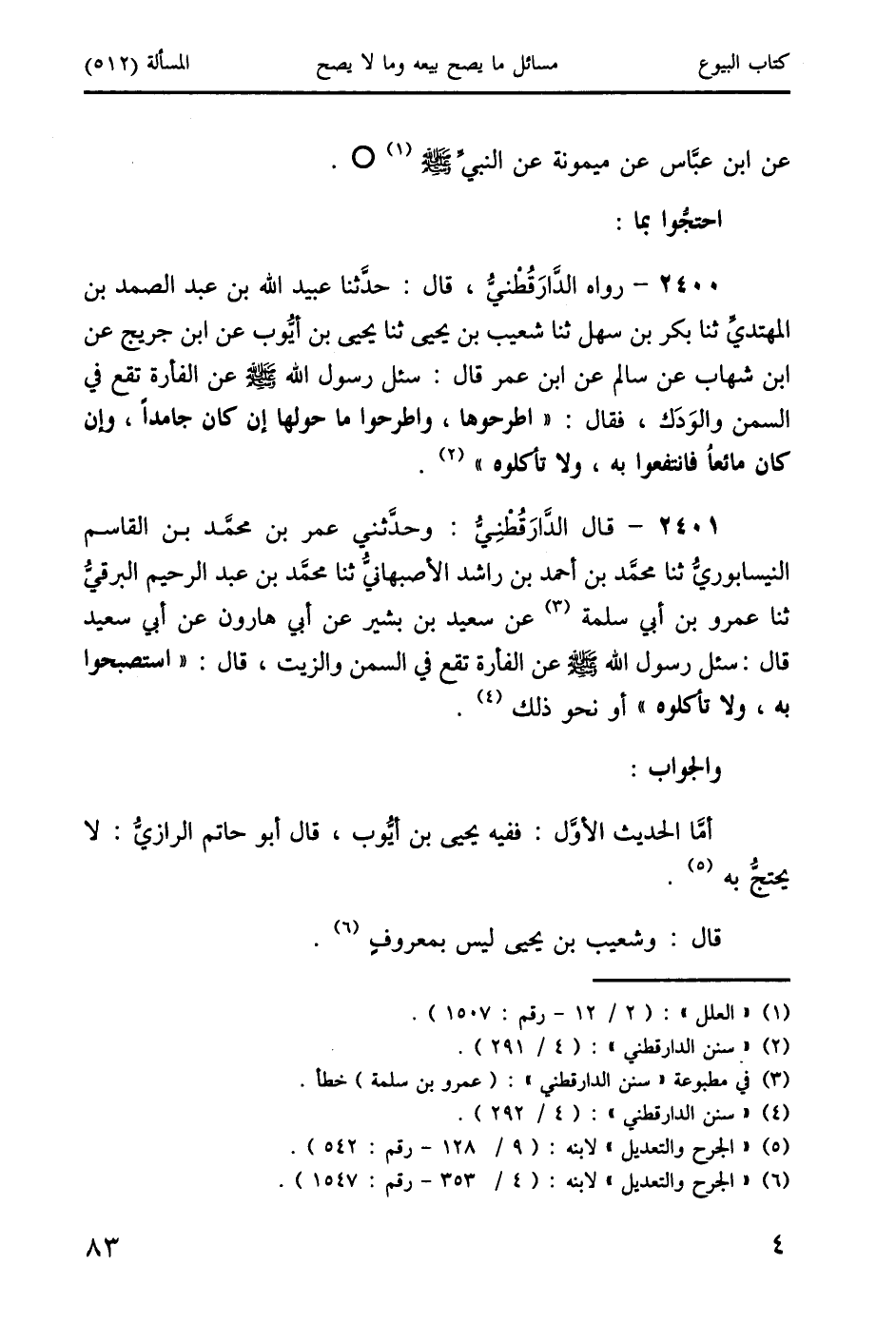 2400 - رواه الدَّارَقُطْنِيُّ، قال: حدَّثنا عبيد الله بن عبد الصمد بن المهتديِّ ثنا بكر بن سهل ثنا شعيب بن يحيى ثنا يحيى بن أيُّوب عن ابن جريج عن ابن شهاب عن سالم عن ابن عمر قال: سئل رسول الله صَلَّى اللَّهُ عَلَيْهِ وَسَلَّمَ عن الفأرة تقع في السمن والوَدَك، فقال: " اطرحوها، واطرحوا ما حولها إن كان جامدًا، وإن كان مائعًا فانتفعوا به، ولا تأكلوه " (2).