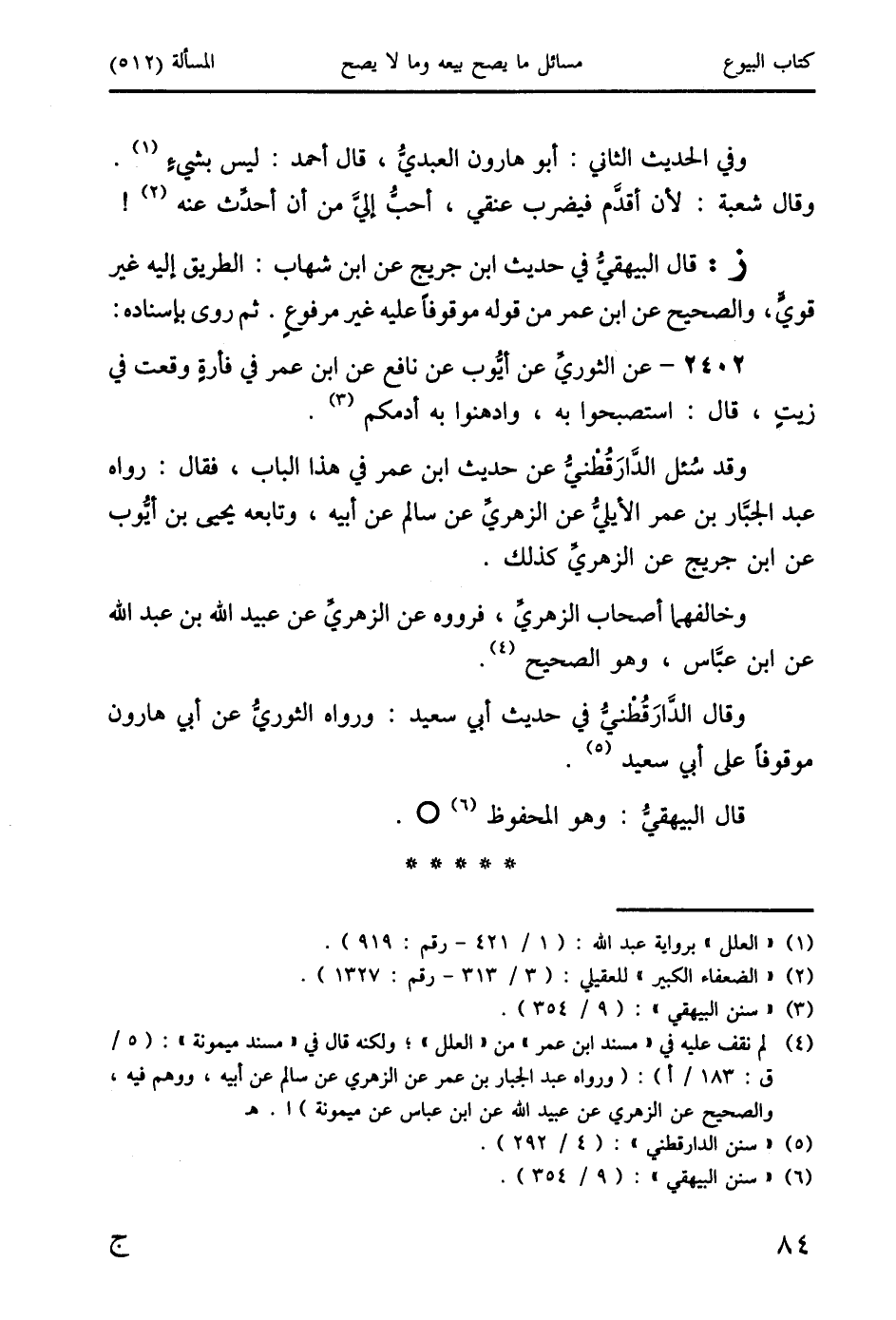 ز: قال البيهقيُّ في حديث ابن جريج عن ابن شهاب: الطريق إليه غير قويٍّ، والصحيح عن ابن عمر من قوله موقوفًا عليه غير مرفوعٍ. ثم روى بإسناده: