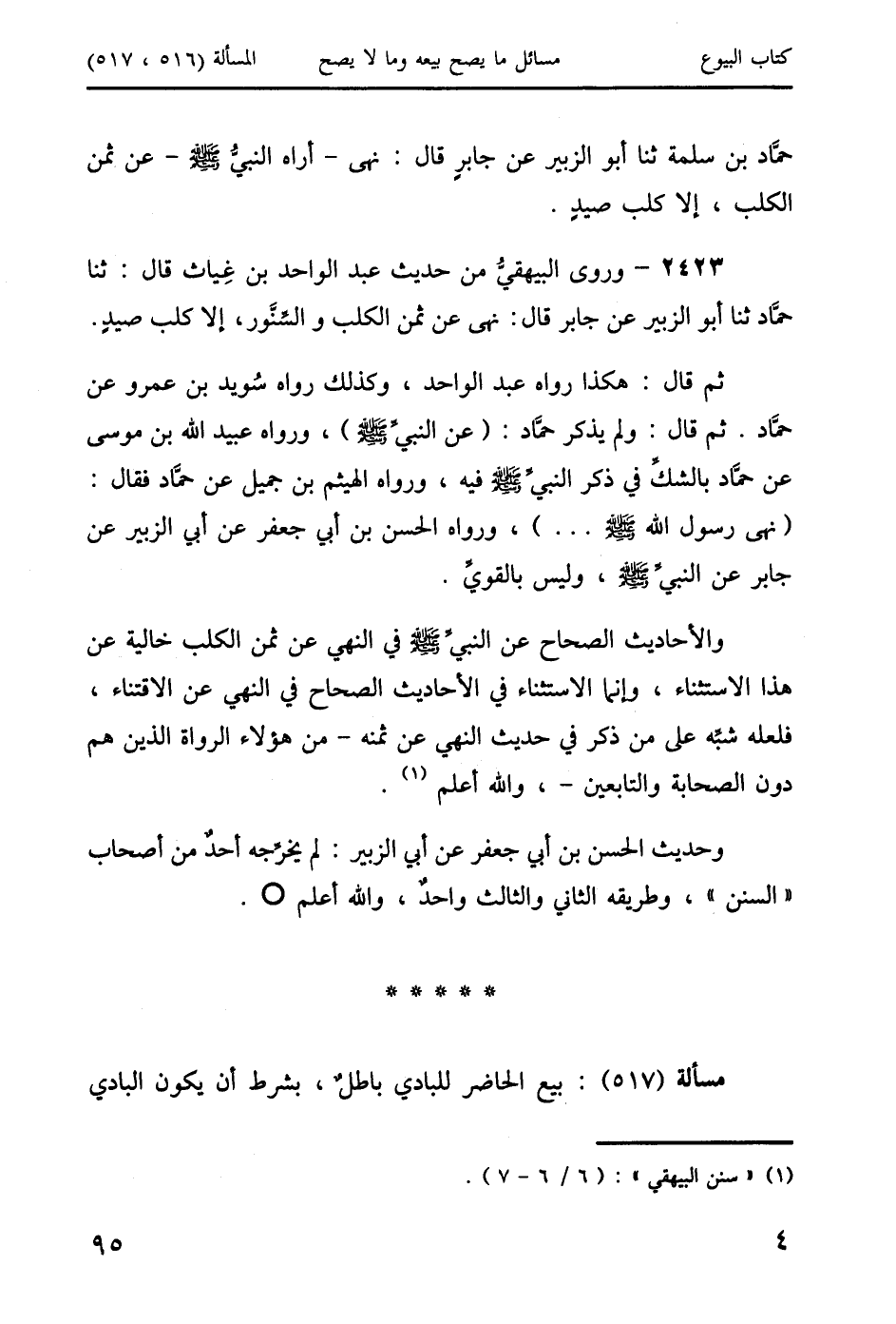 2423 - وروى البيهقيُّ من حديث عبد الواحد بن غِياث قال: ثنا حمَّاد ثنا أبو الزبير عن جابر قال: نهى عن ثمن الكلب والسِّنَّور، إلا كلب صيدٍ.
