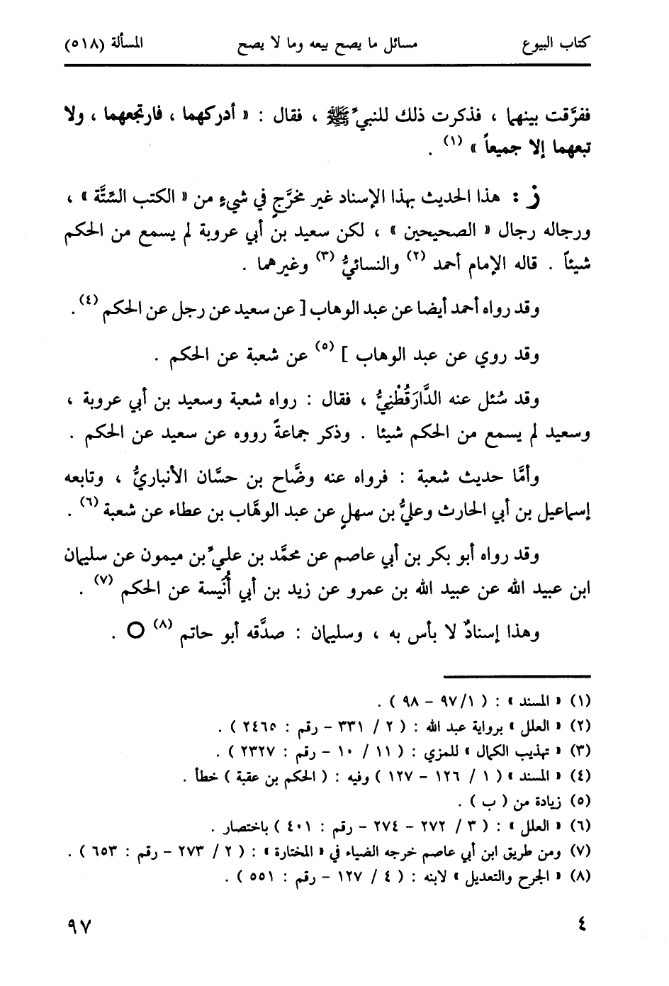 ز: هذا الحديث بهذا الإسناد غير مخرَّجٍ في شيءٍ من "الكتب السِّتَّة"، ورجاله رجال "الصحيحين"، لكن سعيد بن أبي عروبة لم يسمع من الحكم شيئًا. قاله الإمام أحمد (2) والنسائيُّ (3) وغيرهما.
