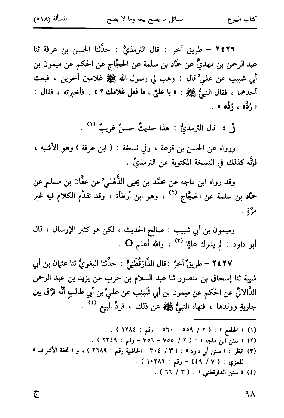 2426 - طريق آخر: قال الترمذيُّ: حدَّثنا الحسن بن عرفة ثنا عبد الرحمن بن مهديٍّ عن حمَّاد بن سلمة عن الحجَّاج عن الحكم عن ميمون بن أبي شبيب عن عليٍّ قال: وهب لي رسول الله-صَلَّى اللَّهُ عَلَيْهِ وَسَلَّمَ غلامين أخوين، فبعت أحدهما فقال النبيُّ صَلَّى اللَّهُ عَلَيْهِ وَسَلَّمَ: " يا عليٌّ، ما فعل غلامك؟ ". فأخبرته، فقال: