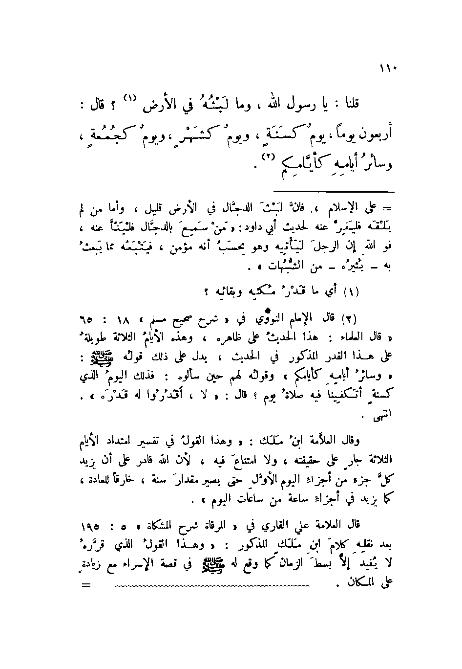 «قلنا: يا رسول الله، وما لبثه في الأرض؟ قال: أربعون يوماً، يوم كسنة، ويوم كشهر، ويوم كجمعة، وسائر أيامه كأيامكم.