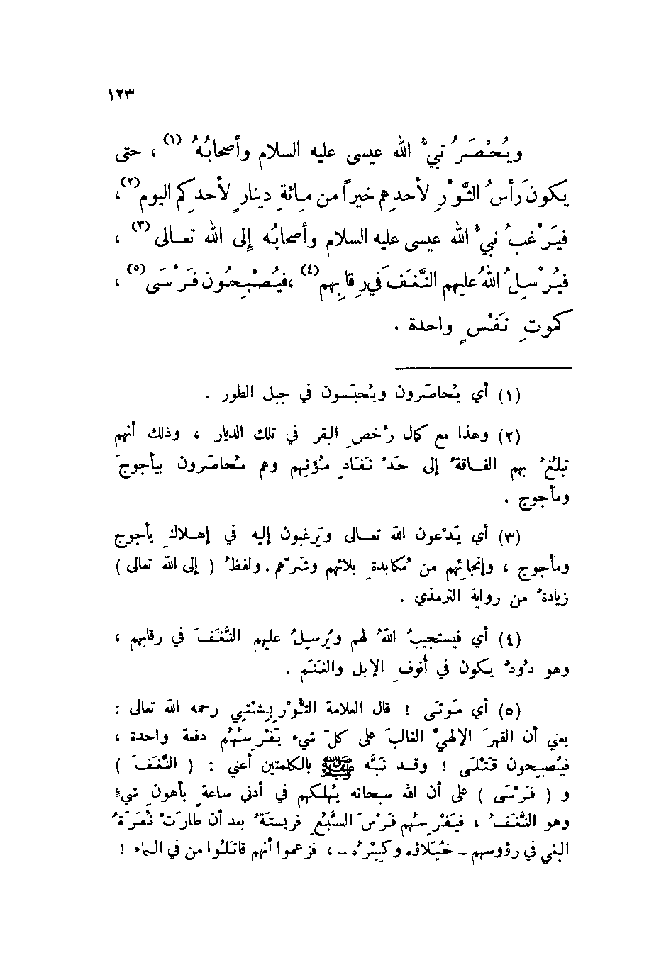 «ويحصر نبي الله عيسى عليه السلام وأصحابه، حتى يكون رأس الثور لأحدهم خيراً من مائة دينار لأحدكم اليوم، فيرغب نبي الله عيسى عليه السلام وأصحابه إلى الله تعالى، فيرسل الله عليهم النغف في رقابهم، فيصبحون فرسى، كموت نفس واحدة.