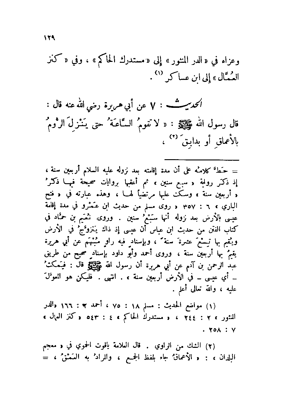 الحديث: 7 عن أبي هريرة رضي الله عنه قال: قال رسول الله صلى الله عليه وسلم: « ((لا تقوم الساعة حتى ينزل الروم بالأعماق أو بدابق،»