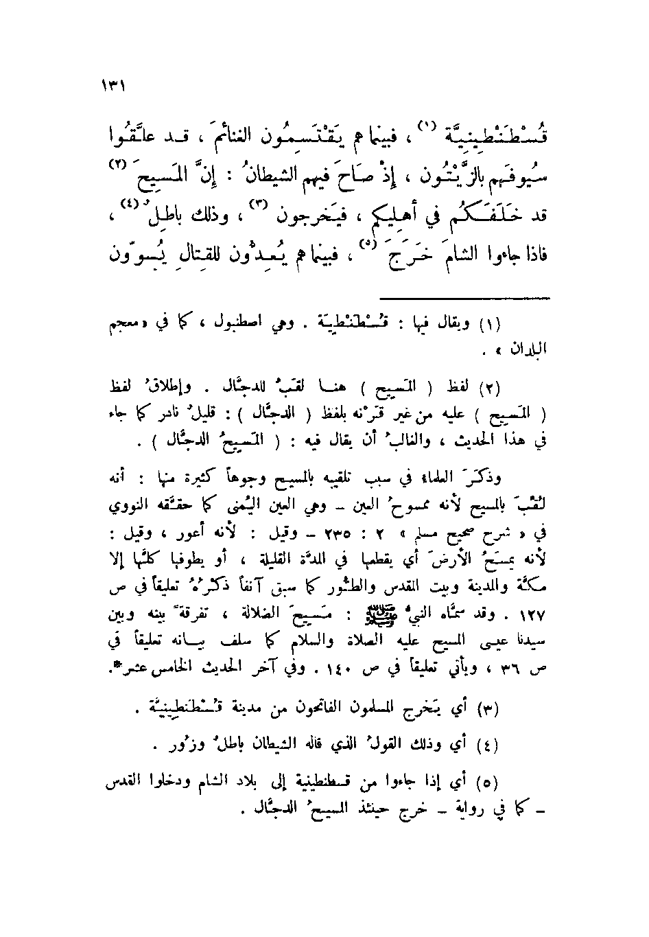 «قسطنطينية، فبينما هم يقتسمون الغنائم، قد علقوا سيوفهم بالزيتون، إذ صاح فيهم الشيطان: إن المسيح قد خلفكم في أهليكم، فيخرجون، وذلك باطل، فإذا جاءوا الشام خرج، فبينما هم يعدون للقتال يسوون»