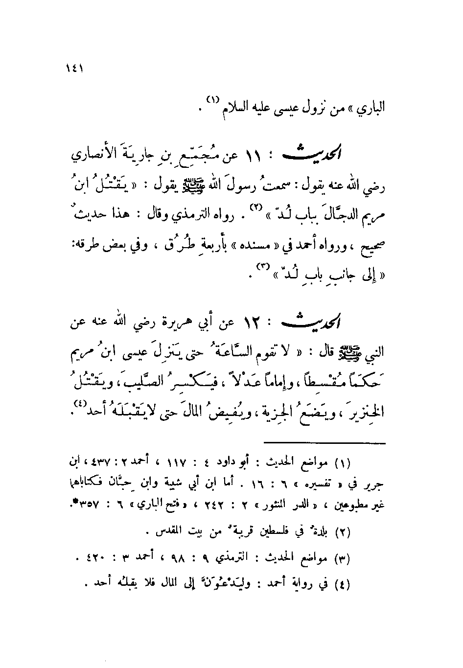 الحديث: 11 عن مجمع بن جارية الأنصاري رضي الله عنه يقول: سمعت رسول الله صلى الله عليه وسلم يقول: « ((يقتل ابن مريم الدجال بباب لد)) » . رواه الترمذي وقال: هذا حديث صحيح، ورواه أحمد في ((مسنده)) بأربعة طرق، وفي بعض طرقه: « ((إلى جانب باب لد)) » .