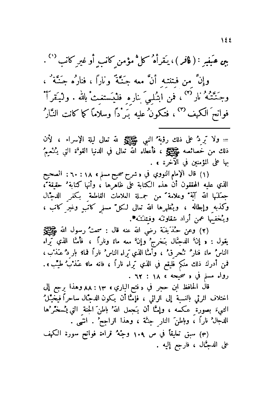 وإن من فتنته أن معه جنة وناراً، فناره جنة، وجنته نار، فمن ابتلي بناره فليستغث بالله. وليقرأ فواتح الكهف، فتكون عليه برداً وسلاماً كما كانت النار»