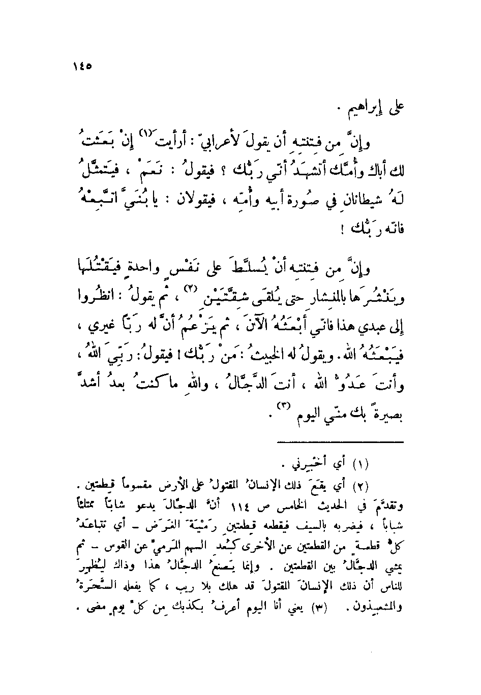 وإن من فتنته أن يقول لأعرابي: أرأيت إن بعثت لك أباك وأمك أتشهد أني ربك؟ فيقول: نعم، فيتمثل له شيطانان في صورة أبيه وأمه، فيقولان: يا بني اتبعه فإنه ربك! .