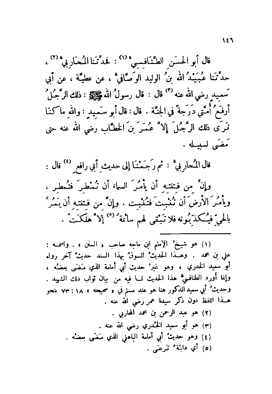 قال أبو الحسن الطنافسي: فحدثنا المحاربي، حدثنا عبيد الله بن الوليد الوصافي، عن عطية، عن أبي سعيد رضي الله عنه قال: قال رسول الله صلى الله عليه وسلم: «ذلك الرجل أرفع أمتي درجة في الجنة» . قال: قال أبو سعيد: والله ما كنا نرى ذلك الرجل إلا عمر بن الخطاب رضي الله عنه حتى مضى لسبيله.