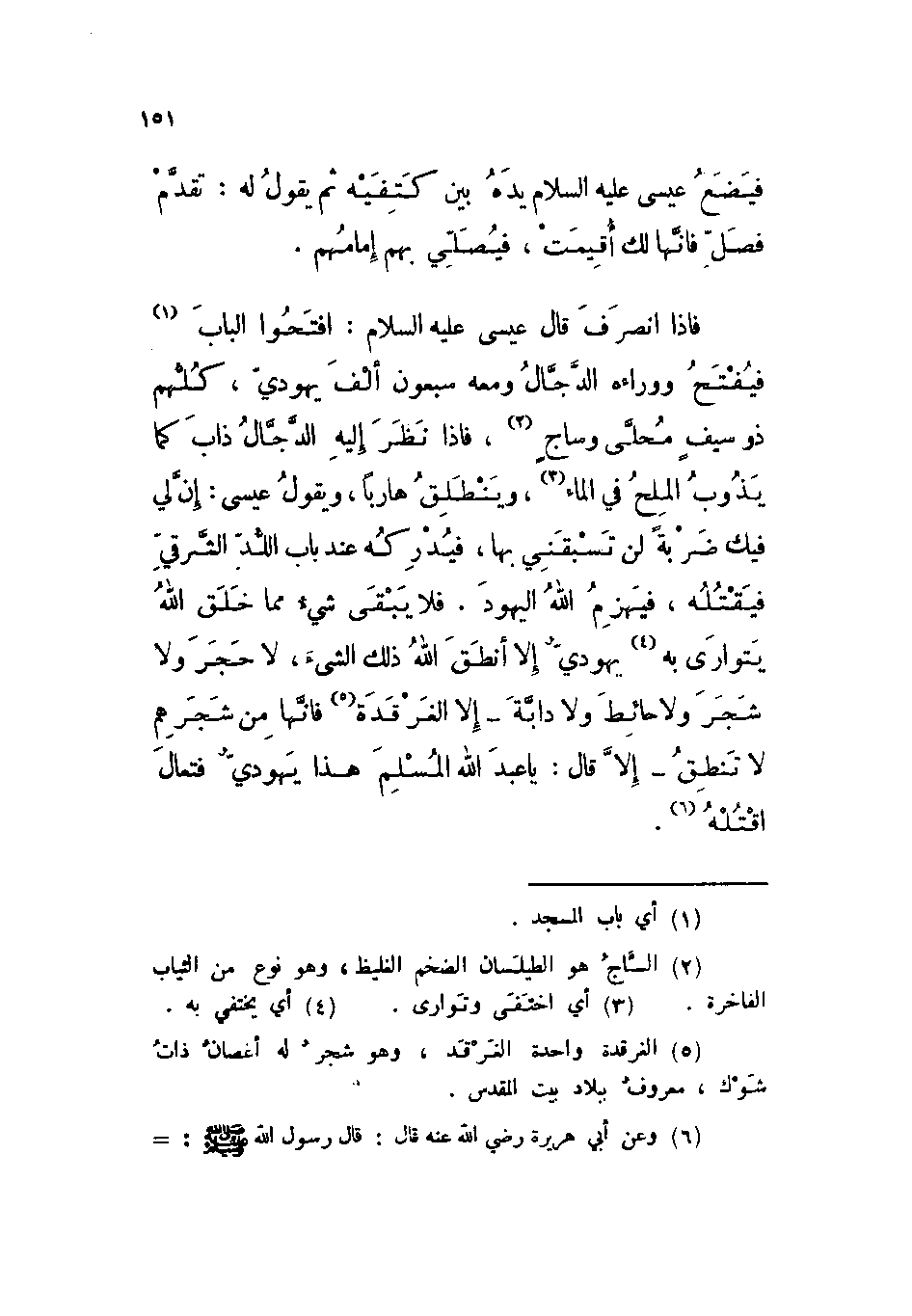 فإذا انصرف قال عيسى عليه السلام: افتحوا الباب، فيفتح ووراءه الدجال ومعه سبعون ألف يهودي، كلهم ذو سيف محلى وساج، فإذا نظر إليه الدجال ذاب كما يذوب الملح في الماء، وينطلق هارباً، ويقول عيسى: إن لي فيك ضربة لن تسبقني بها، فيدركه عند باب اللد الشرقي فيقتله، فيهزم الله اليهود. فلا يبقى شيء مما خلق الله يتوارى به يهودي إلا أنطق الله ذلك الشيء لا حجر ولا شجر ولا حائط ولا دابة - إلا الغرقدة فإنها من شجرهم لا تنطق - إلا قال: يا عبد الله المسلم هذا يهودي فتعال اقتله.