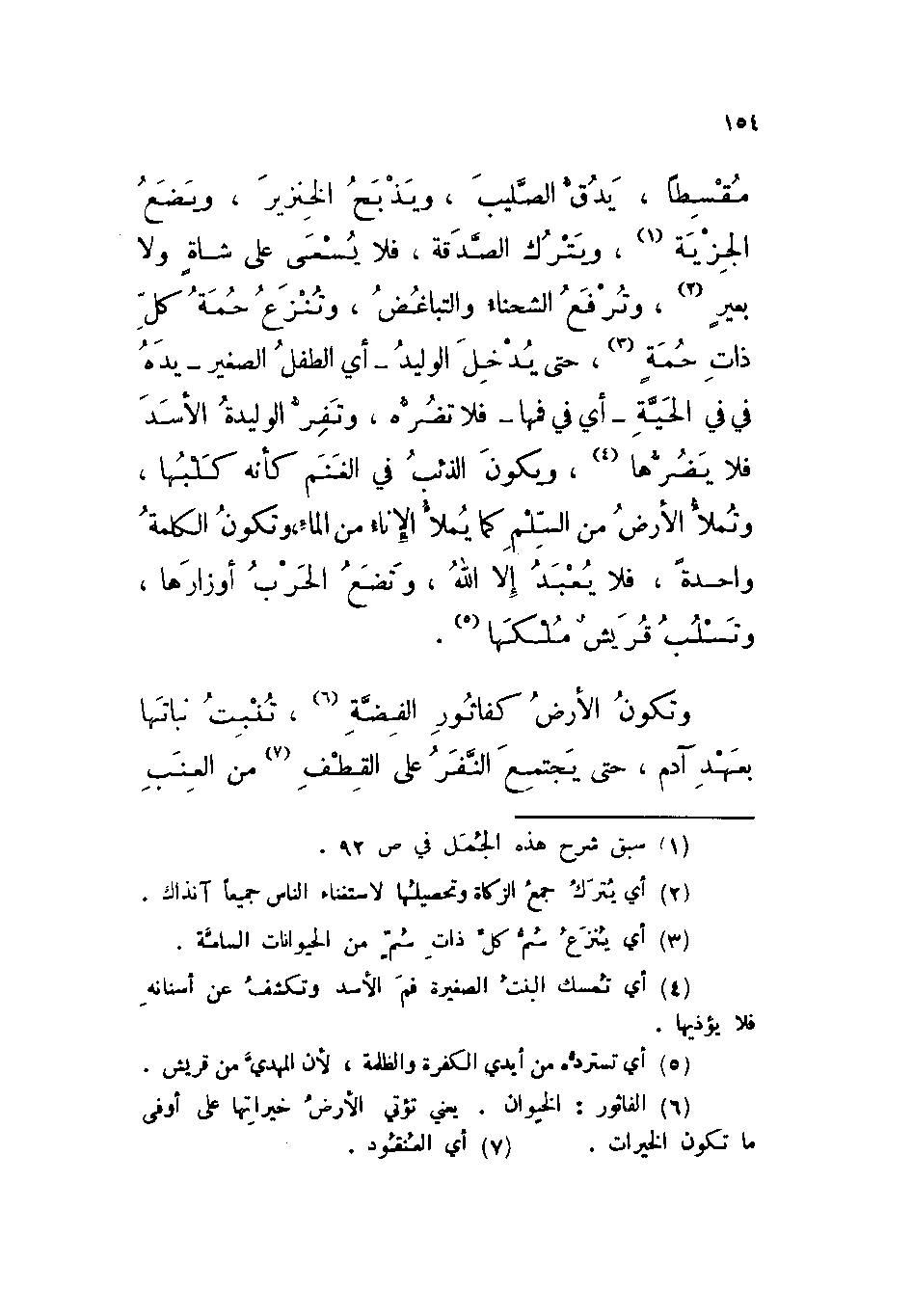 «مقسطاً، يدق الصليب، ويذبح الخنزير، ويضع الجزية، ويترك الصدقة، فلا يسعى على شاة ولا بعير، وترفع الشحناء والتباغض، وتنزع حمة كل ذات حمة، حتى يدخل الوليد - أي الطفل الصغير - يده في في الحية - أي في فمها - فلا تضره، وتفر الوليدة الأسد فلا يضرها، ويكون الذئب في الغنم كأنه كلبها، وتملأ الأرض من السلم كما يملأ الإناء من الماء، وتكون الكلمة واحدة، فلا يعبد إلا الله، وتضع الحرب أوزارها، وتسلب قريش ملكها.