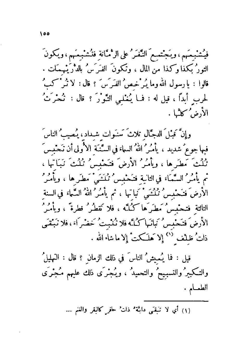 «فيشبعهم، ويجتمع النفر على الرمانة فتشبعهم، ويكون الثور بكذا وكذا من المال، وتكون الفرس بالدريهمات. قالوا: يا رسول الله وما يرخص الفرس؟ قال: لا تركب لحرب أبداً، قيل له: فما يغلي الثور؟ قال: تحرث الأرض كلها.