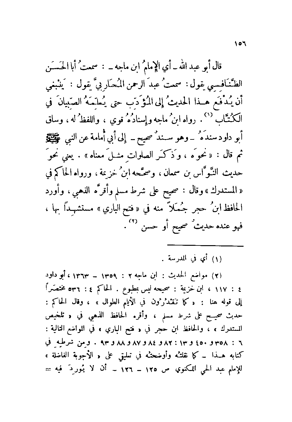 قال أبو عبد الله - أي الإمام ابن ماجه -: سمعت أبا الحسن الطنافسي يقول: سمعت عبد الرحمن المحاربي يقول: ينبغي أن يدفع هذا الحديث إلى المؤدب حتى يعلمه الصبيان في الكتاب. رواه ابن ماجه وإسناده قوي، واللفظ له، وساق أبو داود سنده - وهو سند صحيح - إلى أبي أمامة عن النبي صلى الله عليه وسلم ثم قال: ((نحوه، وذكر الصلوات مثل معناه)) . يعني نحو حديث النواس بن سمعان، وصححه ابن خزيمة، ورواه الحاكم في ((المستدرك)) وقال: صحيح على شرط مسلم، وأقره الذهبي، وأورد الحافظ ابن حجر جملاً منه في ((فتح الباري)) مستشهداً بها، فهو عنده حديث صحيح أو حسن.