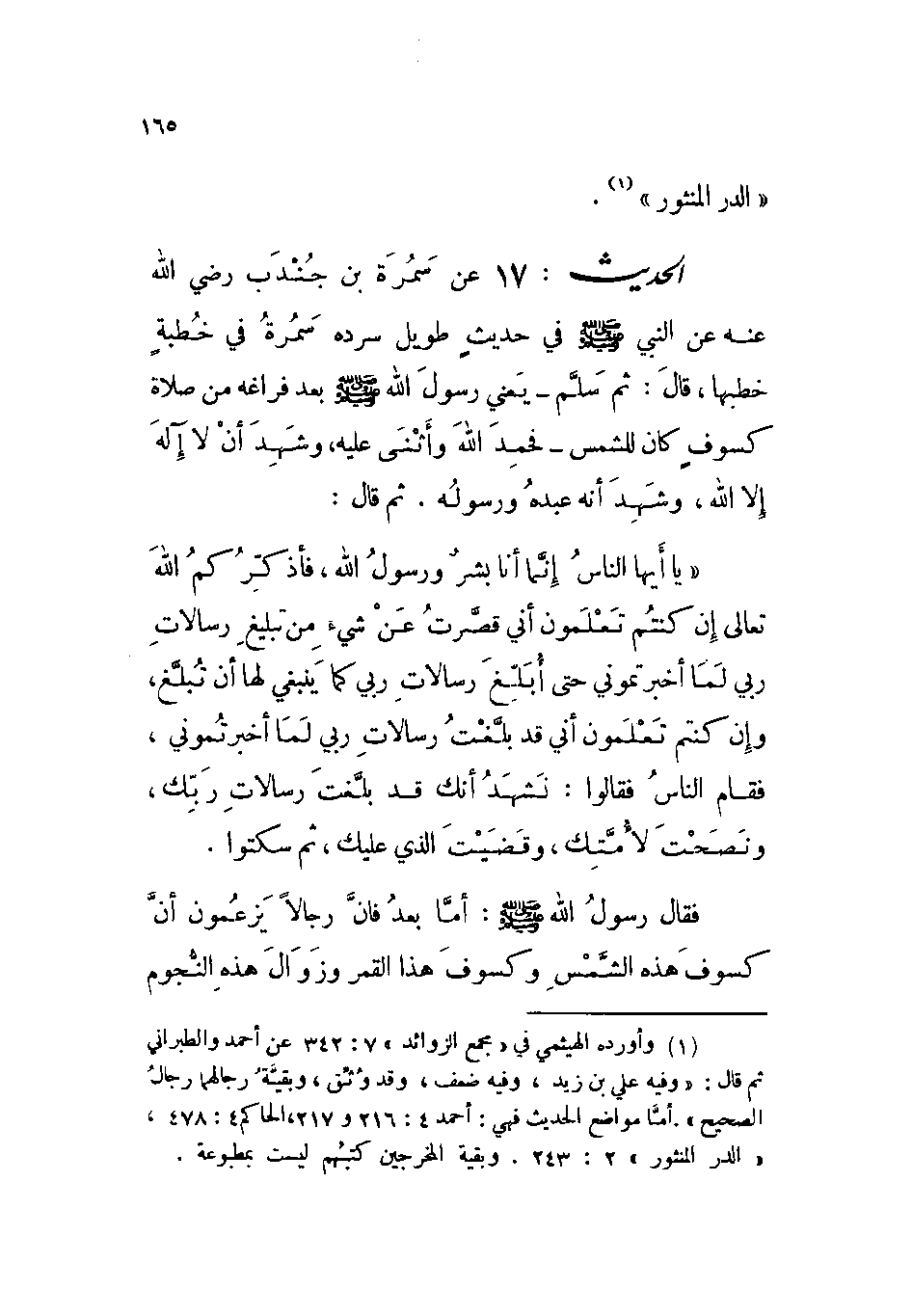 الحديث: 17 عن سمرة بن جندب رضي الله عنه عن النبي صلى الله عليه وسلم في حديث طويل سرده سمرة في خطبة خطبها، قال: ثم سلم - يعني رسول الله صلى الله عليه وسلم بعد فراغه من صلاة كسوف كان للشمس - فحمد الله وأثنى عليه، وشهد أن لا إله إلا الله، وشهد أنه عبده ورسوله. ثم قال: