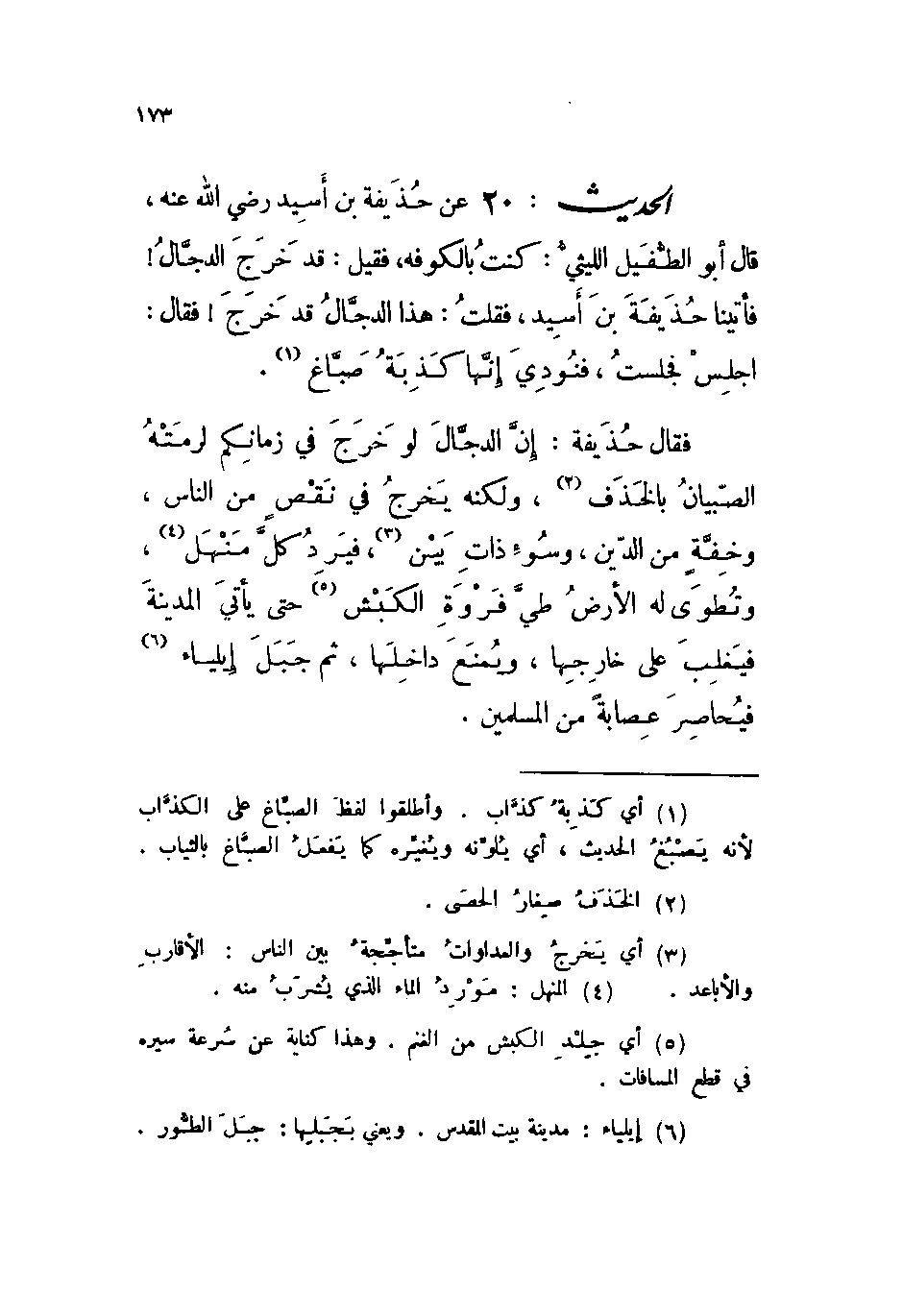 الحديث: 20 عن حذيفة بن أسيد رضي الله عنه، قال أبو الطفيل الليثي: كنت بالكوفة، فقيل: قد خرج الدجال! فأتينا حذيفة بن أسيد، فقلت: هذا الدجال قد خرج! فقال: اجلس، فجلست، فنودي إنها كذبة صباغ.