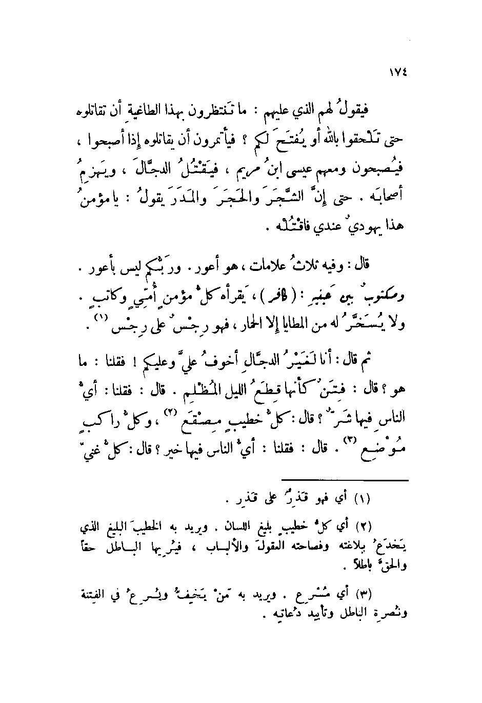 قال: وفيه ثلاث علامات، هو أعور. وربكم ليس بأعور. ومكتوب بين عينيه: (كافر) ، يقرأه كل مؤمن أمي وكاتب. ولا يسخر له من المطايا إلا الحمار، فهو رجس على رجس.