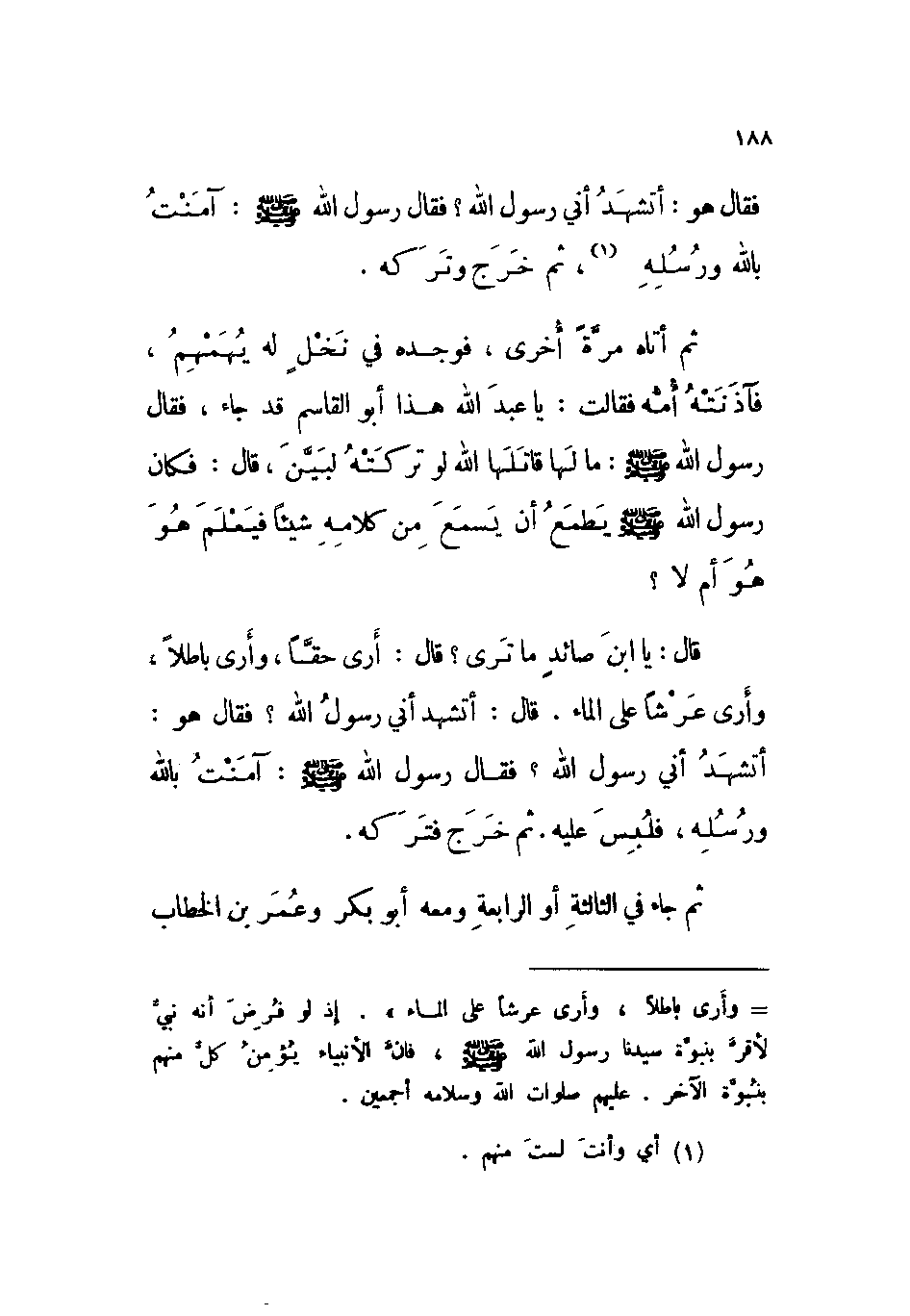 قال: يا ابن صائد ما ترى؟ قال: أرى حقاً، وأرى باطلاً، وأرى عرشاً على الماء. قال: أتشهد أني رسول الله؟ فقال هو: أتشهد أني رسول الله؟ فقال رسول الله صلى الله عليه وسلم: آمنت بالله ورسله، فلبس عليه، ثم خرج فتركه.
