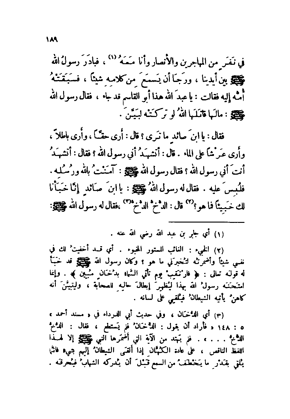 قال: يا ابن صائد ما ترى؟ قال: أرى حقاً، وأرى باطلاً، وأرى عرشاً على الماء. قال: أتشهد أني رسول الله؟ فقال: أتشهد أنت أني رسول الله؟ فقال رسول الله صلى الله عليه وسلم: آمنت بالله ورسله. فلبس عليه. فقال له رسول الله صلى الله عليه وسلم: يا ابن صائد إنا خبأنا لك خبيئاً فما هو؟ قال: الدخ الدخ، فقال له رسول الله صلى الله عليه وسلم:»