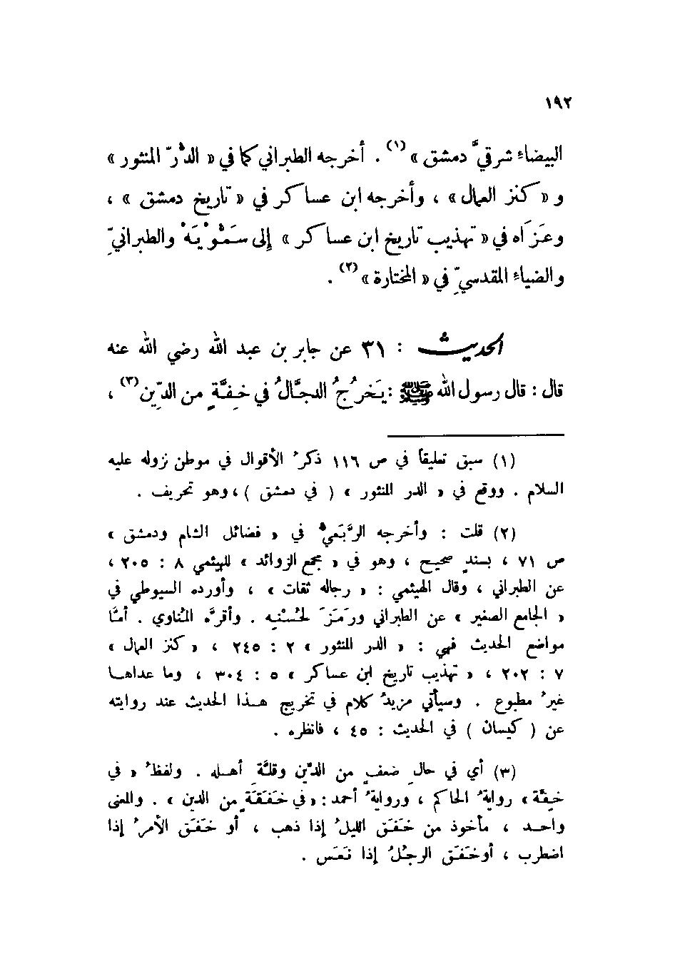 الحديث: 31 عن جابر بن عبد الله رضي الله عنه قال: قال رسول الله صلى الله عليه وسلم: «يخرج الدجال في خفة من الدين،»