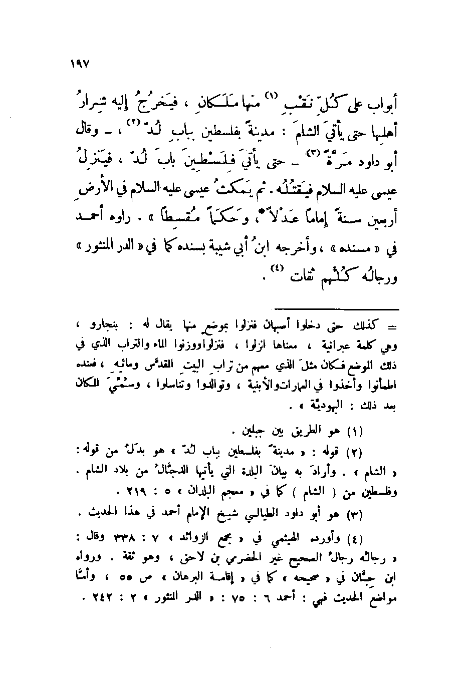 «أبواب، على كل نقب منها ملكان، فيخرج إليه شرار أهلها حتى يأتي الشام: مدينة بفلسطين بباب لد - وقال أبو داود مرة - حتى يأتي فلسطين باب لد، فينزل عيسى عليه السلام فيقتله. ثم يمكث عيسى عليه السلام في الأرض أربعين سنة إماماً عدلاً، وحكماً مقسطاً)) » . رواه أحمد في ((مسنده)) ، وأخرجه ابن أبي شيبة بسنده كما في ((الدر المنثور)) ورجاله كلهم ثقات.
