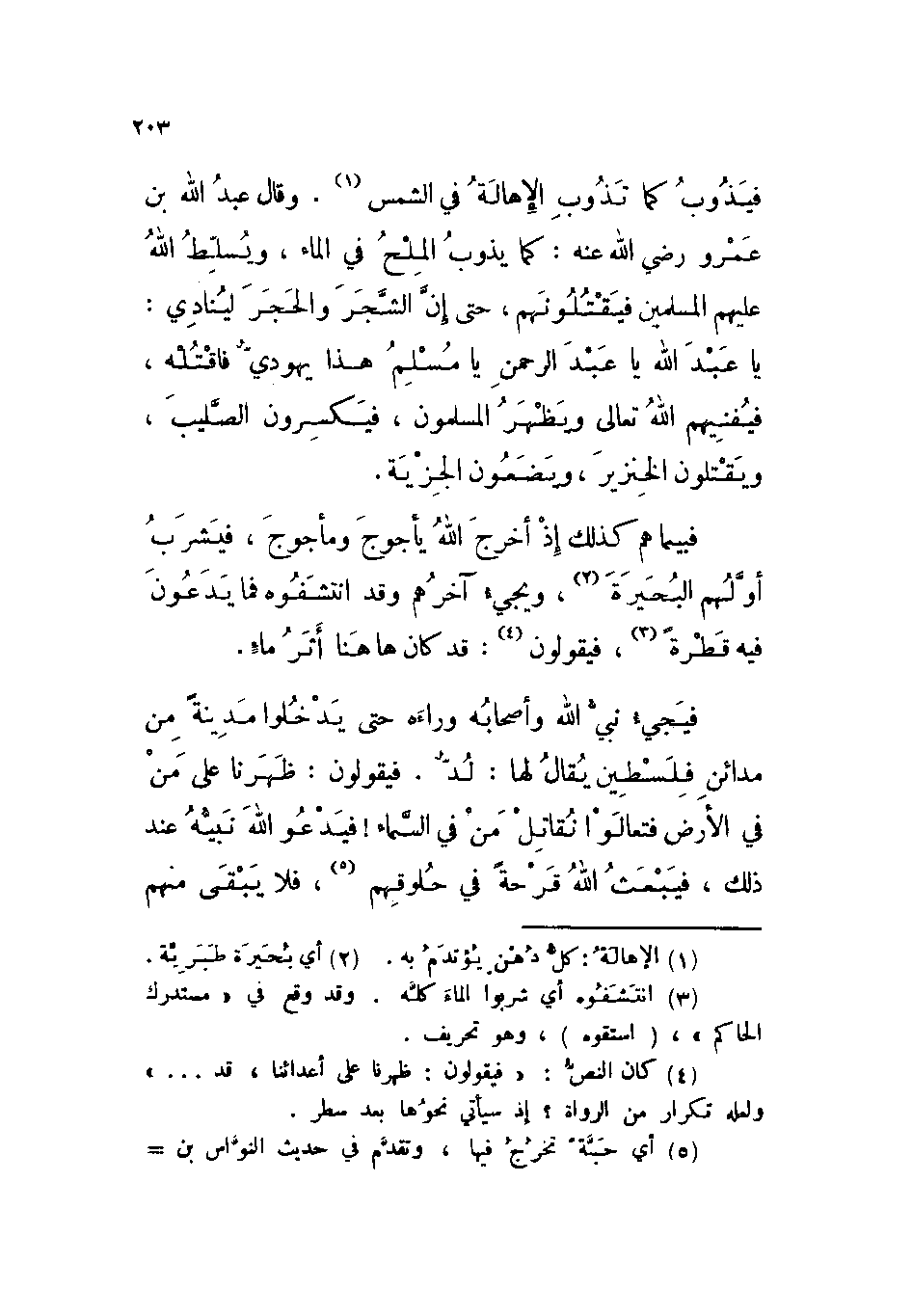 «فيذوب كما تذوب الإهالة في الشمس. وقال عبد الله بن عمرو رضي الله عنه: كما يذوب الملح في الماء، ويسلط الله عليهم المسلمين فيقتلونهم، حتى إن الشجر والحجر لينادي: يا عبد الله يا عبد الرحمن يا مسلم هذا يهودي فاقتله، فيفنيهم الله تعالى ويظهر المسلمون، فيكسرون الصليب، ويقتلون الخنزير، ويضعون الجزية.