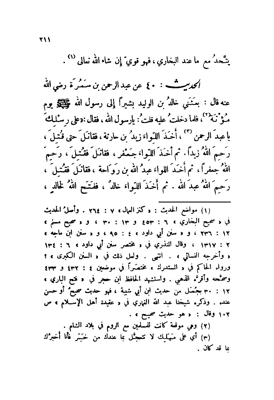 الحديث: 40 «عن عبد الرحمن بن سمرة رضي الله عنه قال: بعثني خالد بن الوليد بشيراً إلى رسول الله صلى الله عليه وسلم يوم مؤتة، فلما دخلت عليه قلت: يا رسول الله، فقال: ((على رسلك يا عبد الرحمن، أخذ اللواء زيد بن حارثة، فقاتل حتى قتل، رحم الله زيداً. ثم أخذ اللواء جعفر، فقاتل فقتل، رحم الله جعفراً، ثم أخذ اللواء عبد الله بن رواحة، فقاتل فقتل، رحم الله عبد الله. ثم أخذ اللواء خالد، ففتح الله لخالد،»