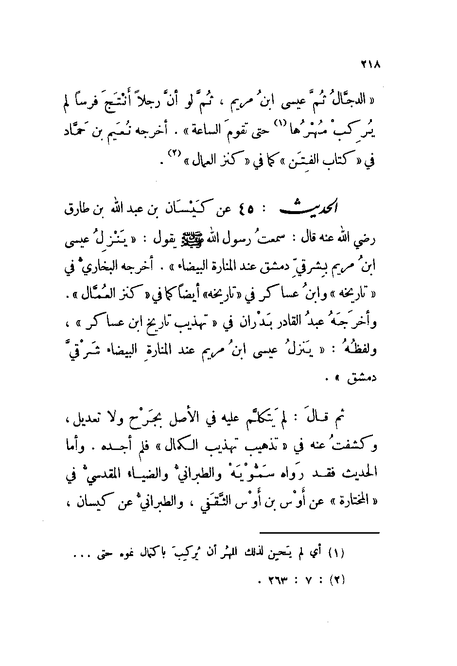 الحديث: 45 عن كيسان بن عبد الله بن طارق رضي الله عنه قال: سمعت رسول الله صلى الله عليه وسلم يقول: « ((ينزل عيسى ابن مريم بشرقي دمشق عند المنارة البيضاء)) » . أخرجه البخاري في ((تاريخه)) وابن عساكر في ((تاريخه)) أيضاً كما في ((كنز العمال)) . وأخرجه عبد القادر بدران في ((تهذيب تاريخ ابن عساكر)) ، ولفظه: « ((ينزل عيسى ابن مريم عند المنارة البيضاء شرقي دمشق)) » .