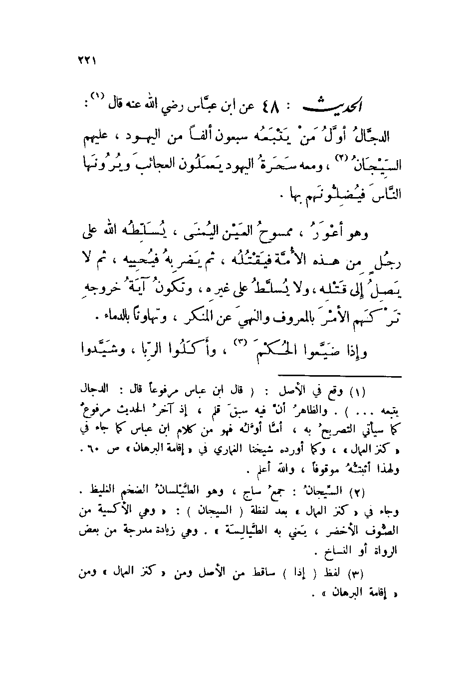 الحديث: 48 عن ابن عباس رضي الله عنه قال: الدجال أول من يتبعه سبعون ألفاً من اليهود، عليهم السيجان، ومعه سحرة اليهود يعملون العجائب ويرونها الناس فيضلونهم بها.