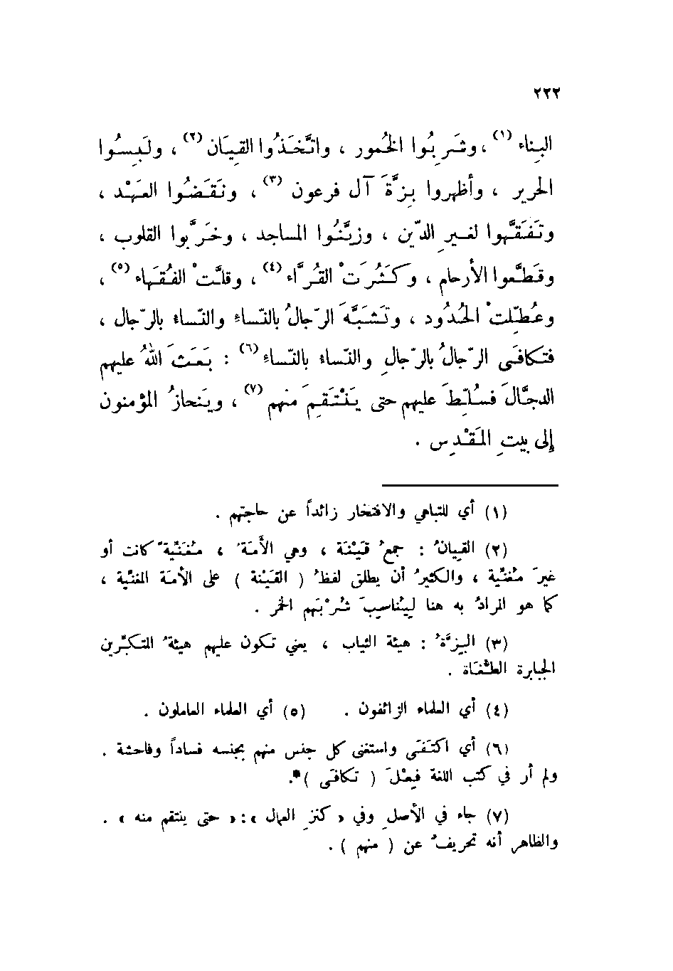 البناء، وشربوا الخمور، واتخذوا القيان، ولبسوا الحرير، وأظهروا بزة آل فرعون، ونقضوا العهد، وتفقهوا لغير الدين، وزينوا المساجد، وخربوا القلوب، وقطعوا الأرحام، وكثرت القراء، وقلت الفقهاء، وعطلت الحدود، وتشبه الرجال بالنساء والنساء بالرجال، فتكافى الرجال بالرجال والنساء بالنساء: بعث الله عليهم الدجال فسلط عليهم حتى ينتقم منهم، وينحاز المؤمنون إلى بيت المقدس.