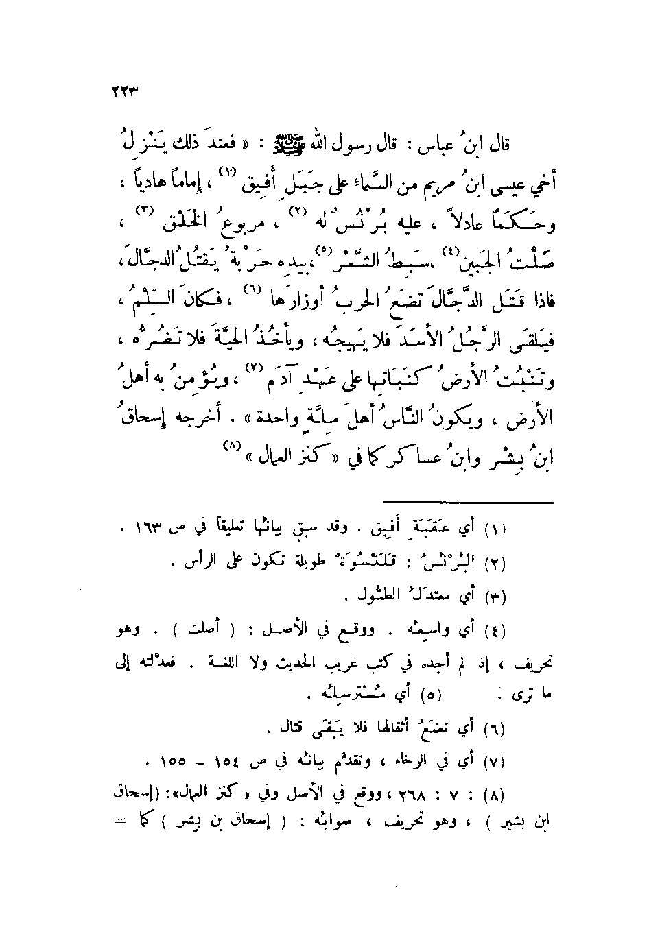 قال ابن عباس: قال رسول الله صلى الله عليه وسلم: « ((فعند ذلك ينزل أخي عيسى ابن مريم من السماء على جبل أفيق، إماماً هادياً، وحكماً عادلاً، عليه برنس له، مربوع الخلق، صلت الجبين، سبط الشعر، بيده حربة يقتل الدجال، فإذا قتل الدجال تضع الحرب أوزارها، فكان السلم، فيلقى الرجل الأسد فلا يهيجه، ويأخذ الحية فلا تضره، وتنبت الأرض كنباتها على عهد آدم، ويؤمن به أهل الأرض، ويكون الناس أهل ملة واحدة)) » . أخرجه إسحاق بن بشر وابن عساكر كما في ((كنز العمال)) .
