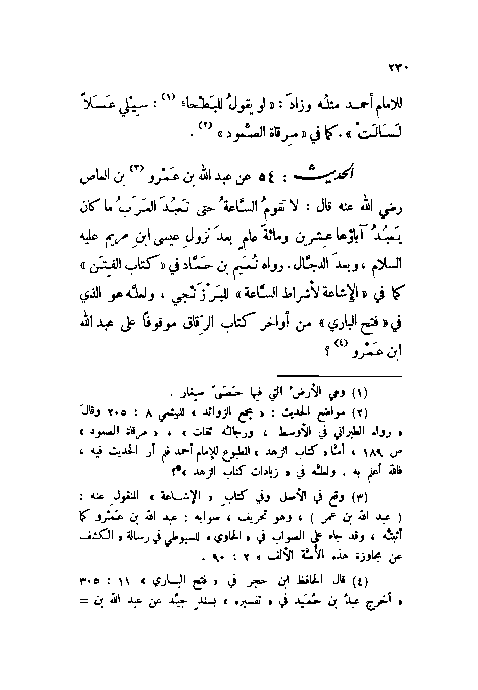 الحديث: 54 عن عبد الله بن عمرو بن العاص رضي الله عنه قال: لا تقوم الساعة حتى تعبد العرب ما كان يعبد آباؤها عشرين ومائة عام بعد نزول عيسى ابن مريم عليه السلام، وبعد الدجال. رواه نعيم بن حماد في ((كتاب الفتن)) كما في ((الإشاعة لأشراط الساعة)) للبرزنجي، ولعله هو الذي في ((فتح الباري)) من أواخر كتاب الرقاق موقوفاً على عبد الله بن عمرو.