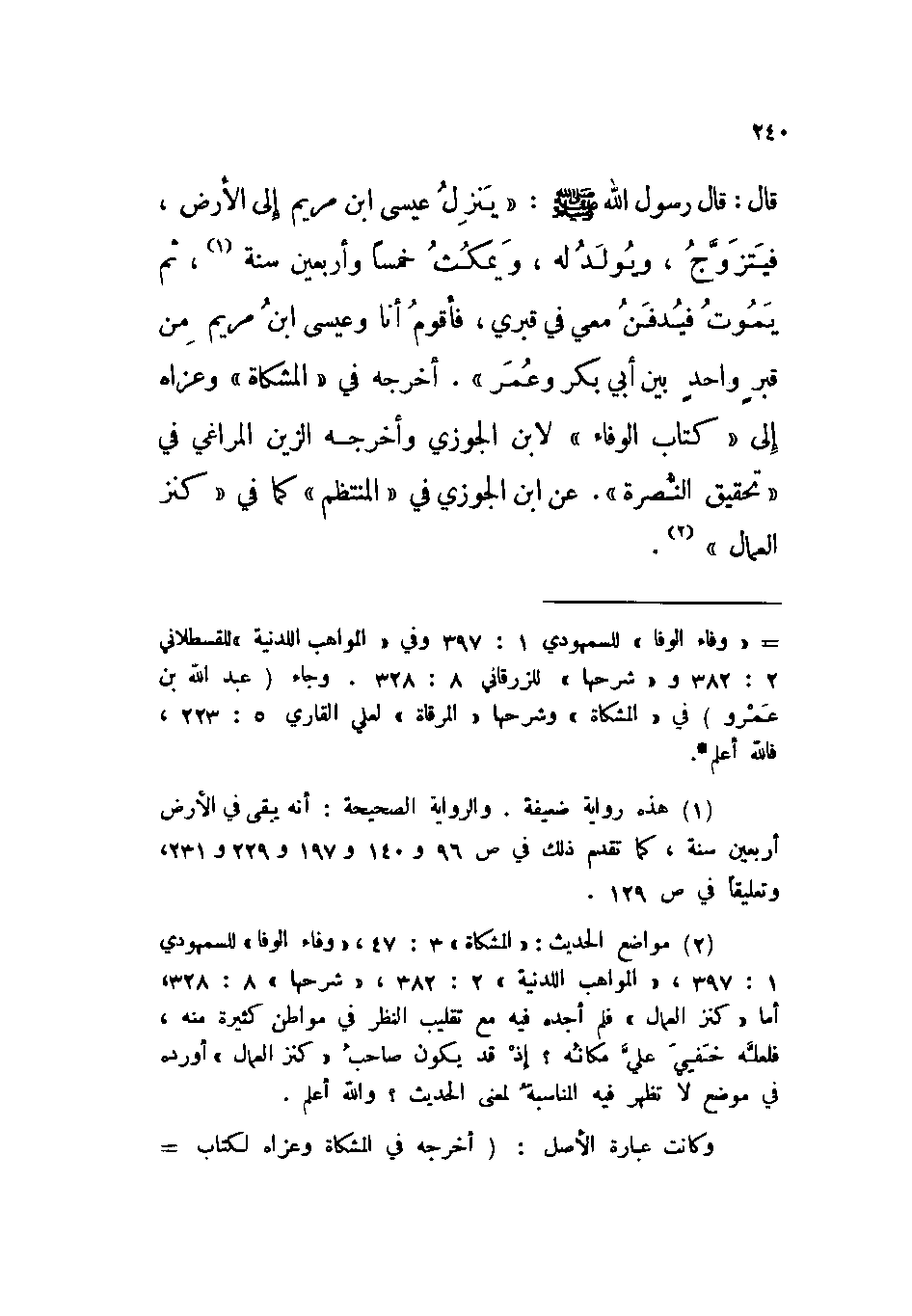 قال: قال رسول الله صلى الله عليه وسلم: « ((ينزل عيسى ابن مريم إلى الأرض، فيتزوج، ويولد له، ويمكث خمساً وأربعين سنة، ثم يموت فيدفن معي في قبري، فأقوم أنا وعيسى ابن مريم من قبر واحد بين أبي بكر وعمر)) » . أخرجه في ((المشكاة)) وعزاه إلى ((كتاب الوفاء)) لابن الجوزي، وأخرجه الزين المراغي في ((تحقيق النصرة)) . عن ابن الجوزي في ((المنتظم)) كما في ((كنز العمال)) .
