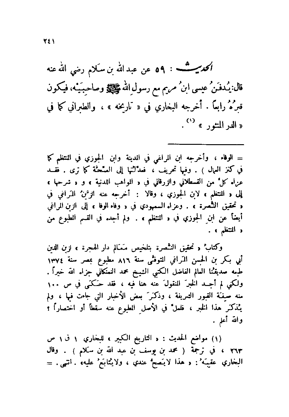 الحديث: 59 عن عبد الله بن سلام رضي الله عنه قال: يدفن عيسى ابن مريم مع رسول الله صلى الله عليه وسلم وصاحبيه، فيكون قبره رابعاً. أخرجه البخاري في ((تاريخه)) ، والطبراني كما في ((الدر المنثور)) .